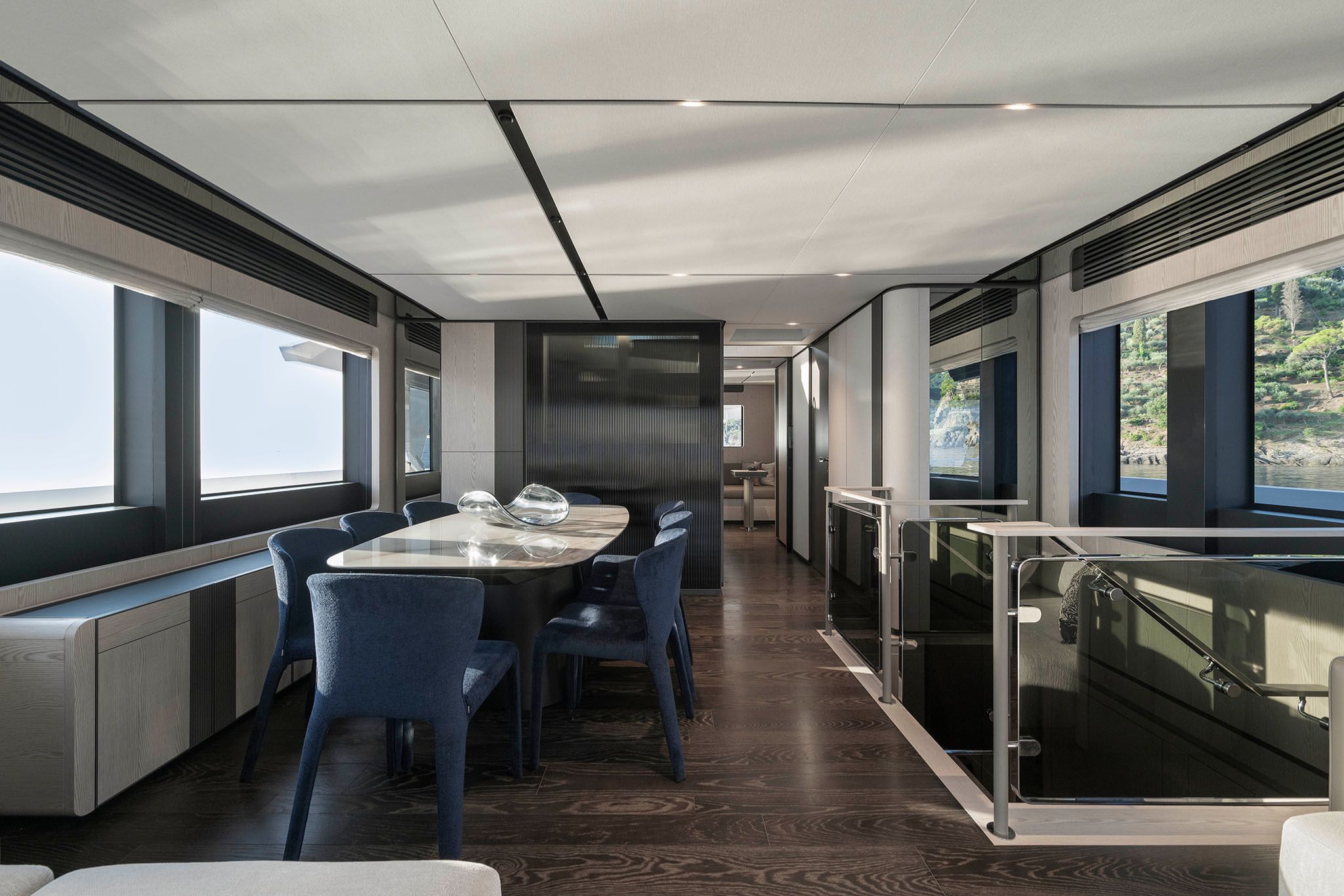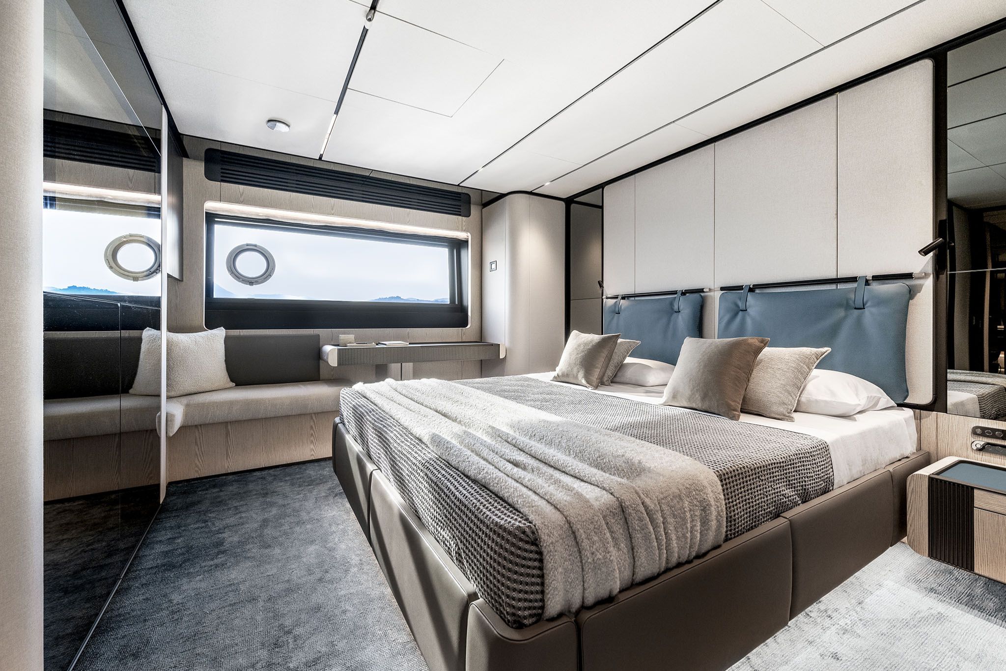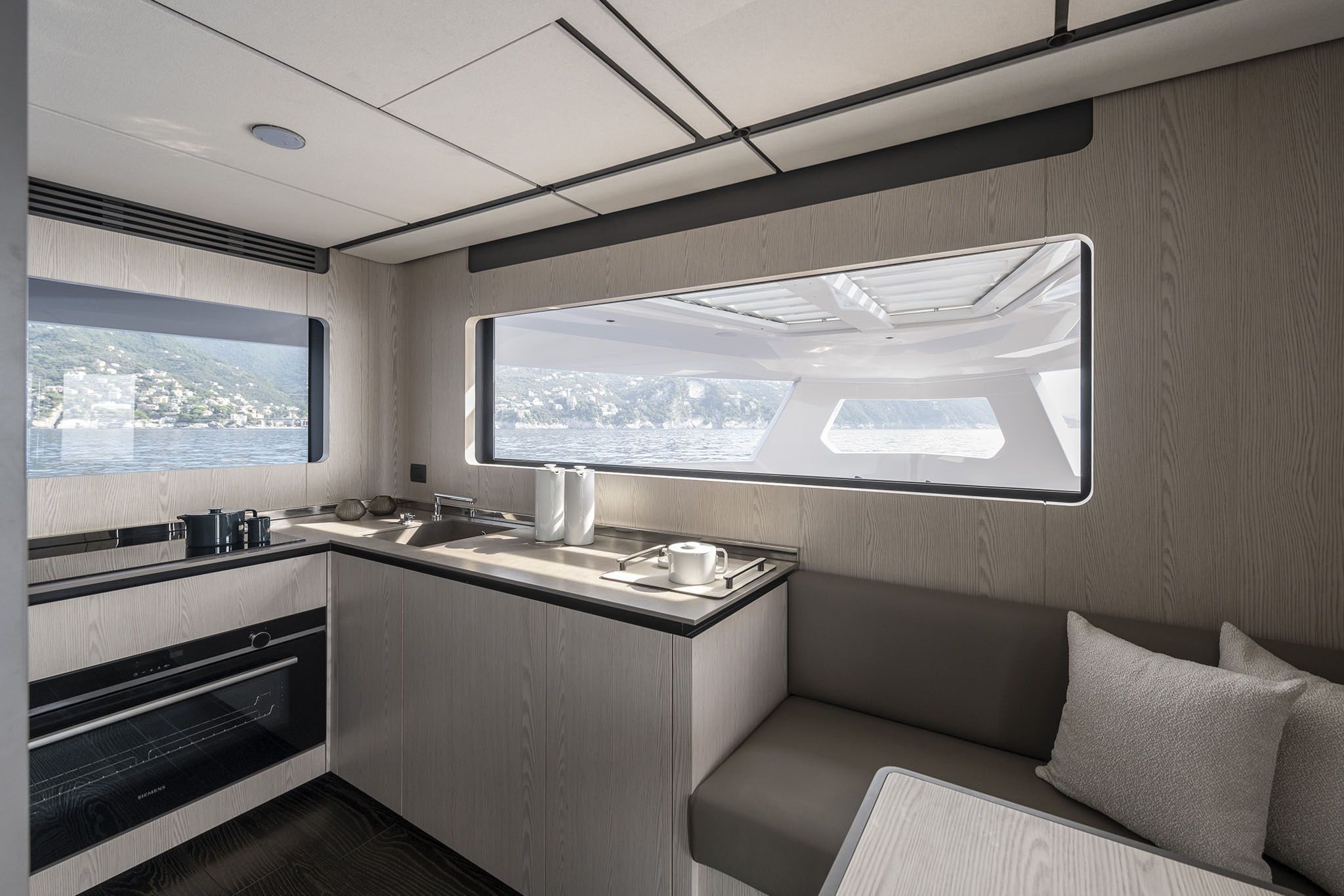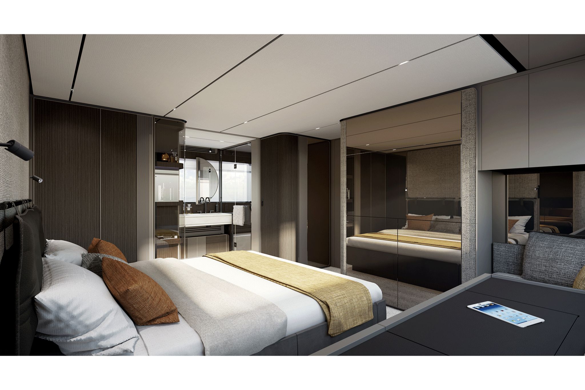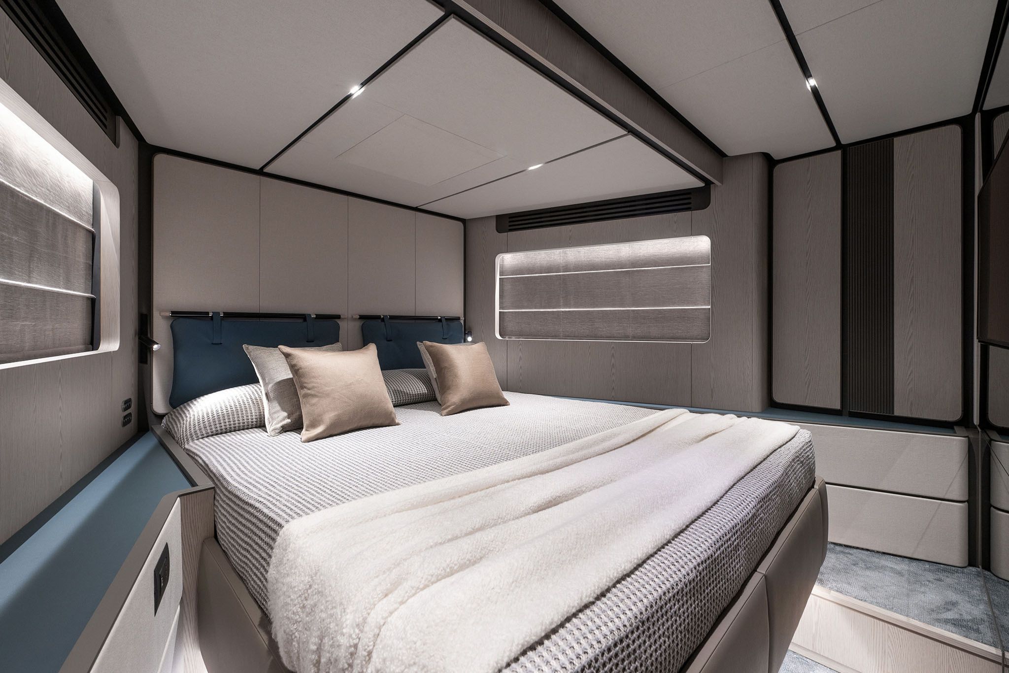Det ikoniske træk er den overdækkede terrasse, der kombinerer privatliv, komfort og beskyttelse med direkte kontakt til hav og natur. Indretningen kan vælges i to moods: Classic, med jordnære toner, eller Contemporary, inspireret af havets farver. Begge skaber en elegant atmosfære, hvor yachten bliver en naturlig forlængelse af hjemmet.