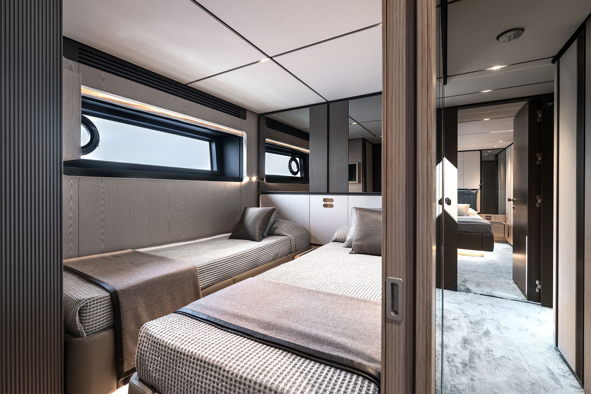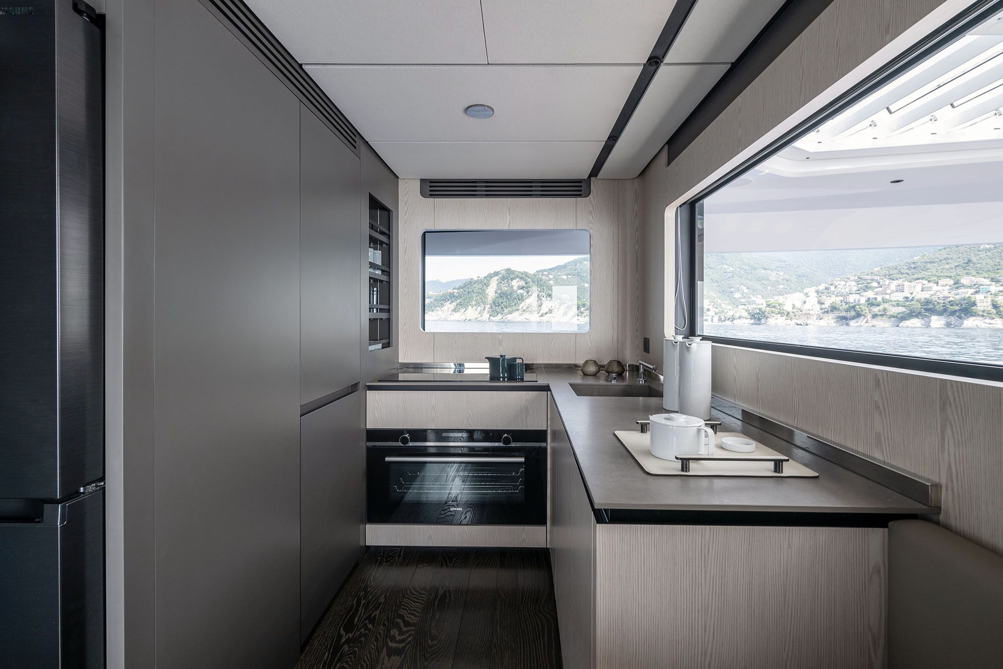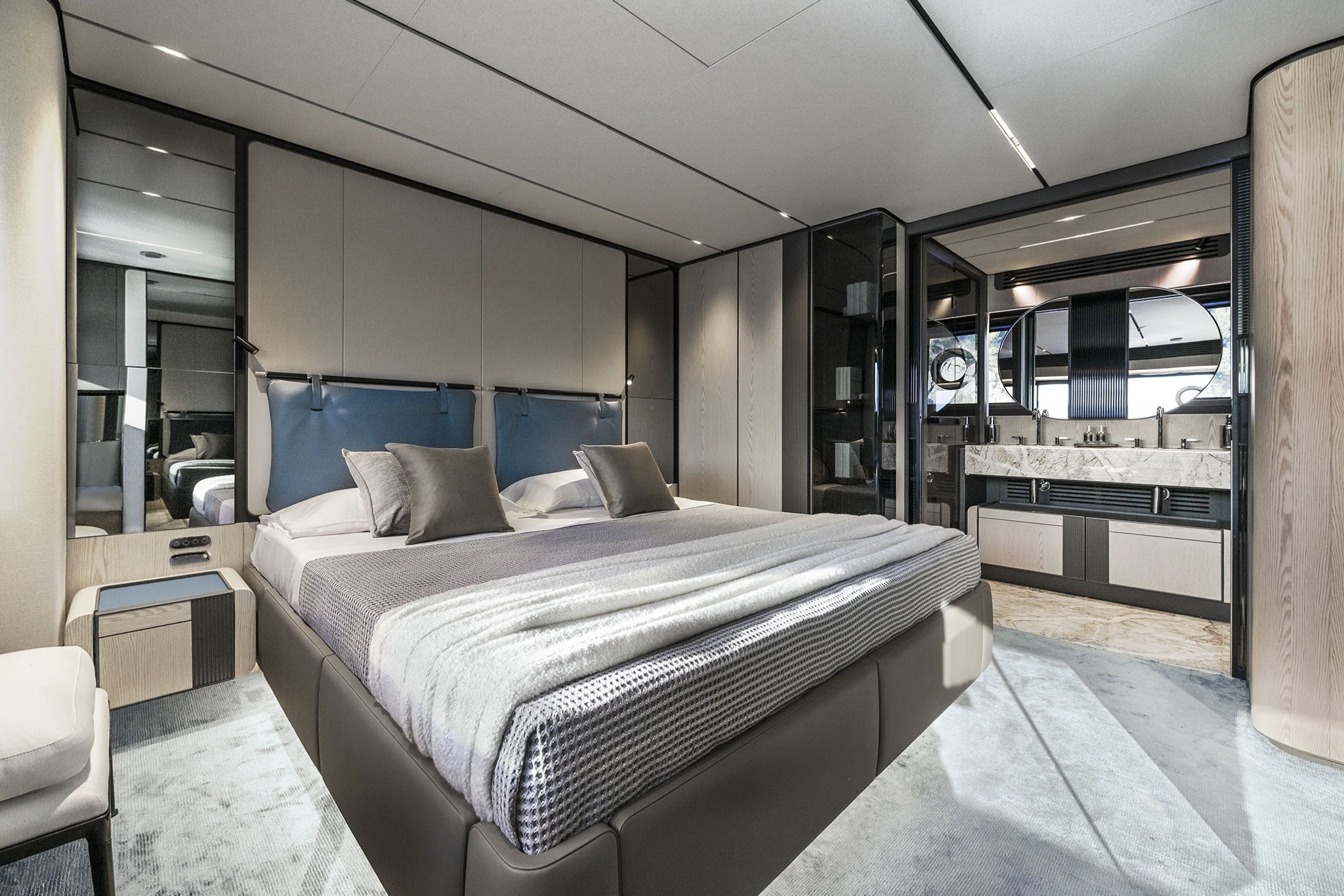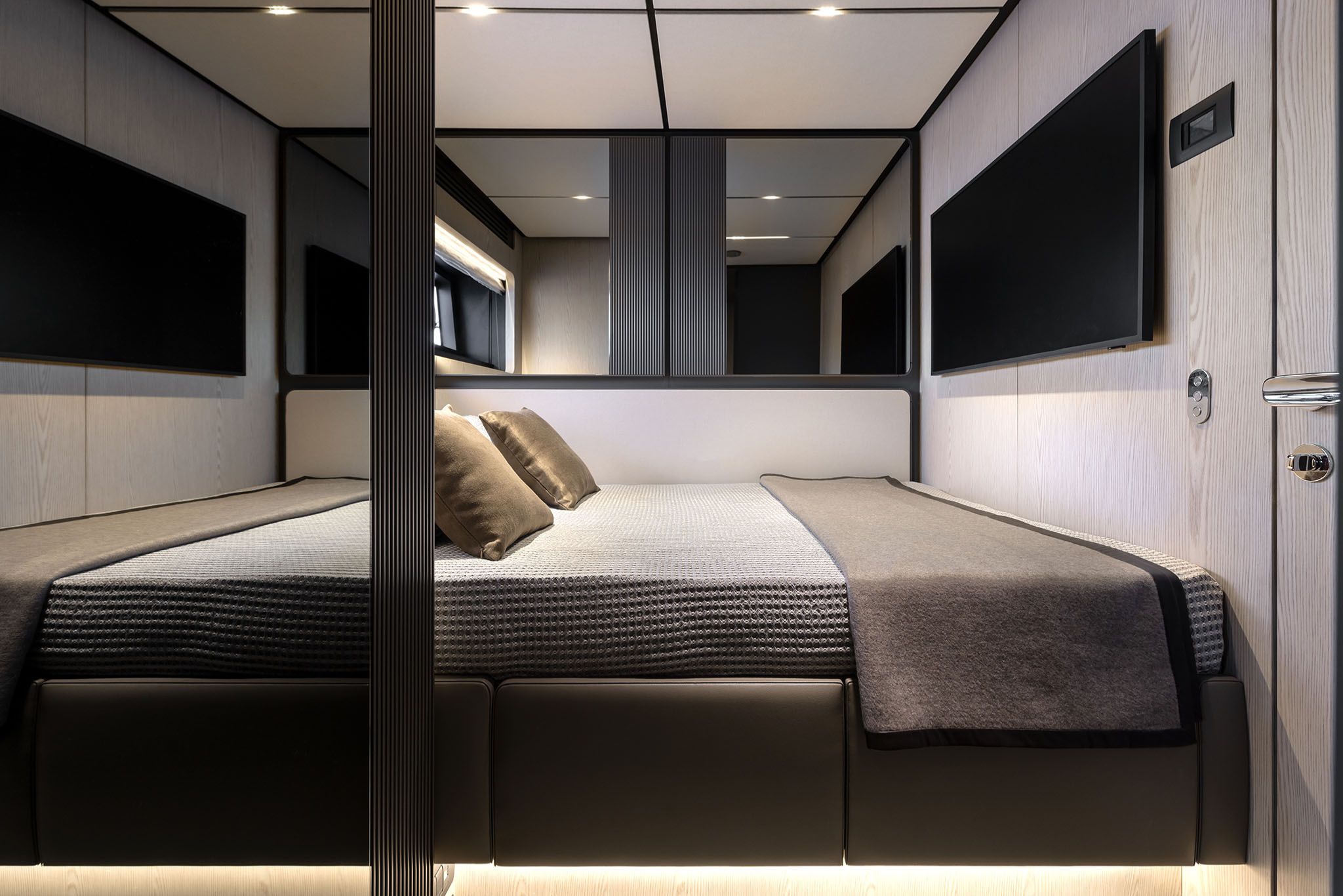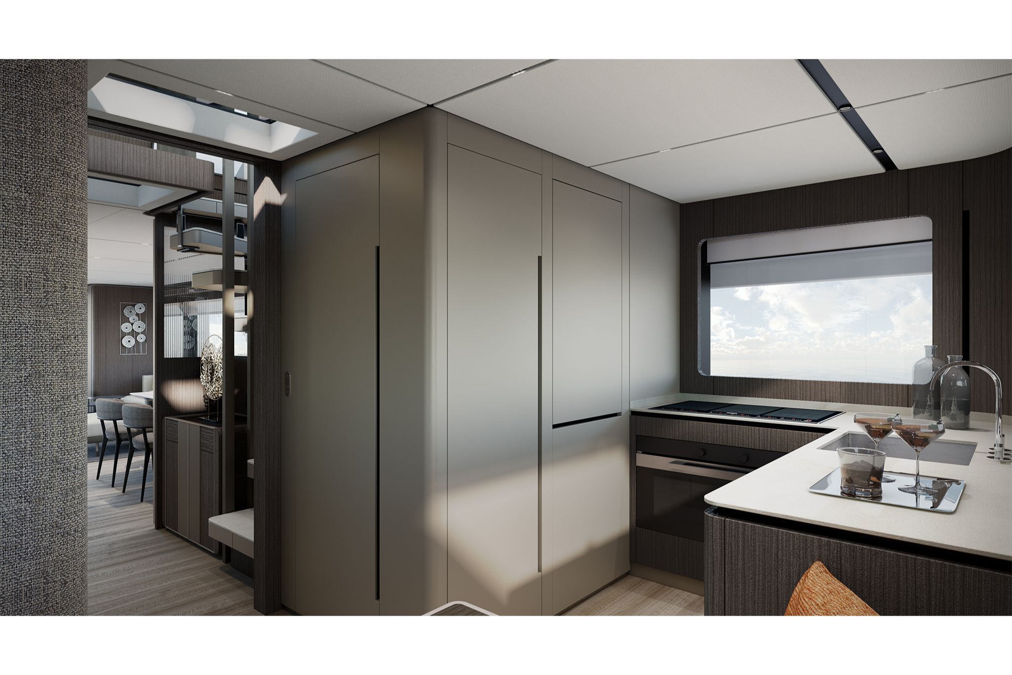Det ikoniske træk er den overdækkede terrasse, der kombinerer privatliv, komfort og beskyttelse med direkte kontakt til hav og natur. Indretningen kan vælges i to moods: Classic, med jordnære toner, eller Contemporary, inspireret af havets farver. Begge skaber en elegant atmosfære, hvor yachten bliver en naturlig forlængelse af hjemmet.