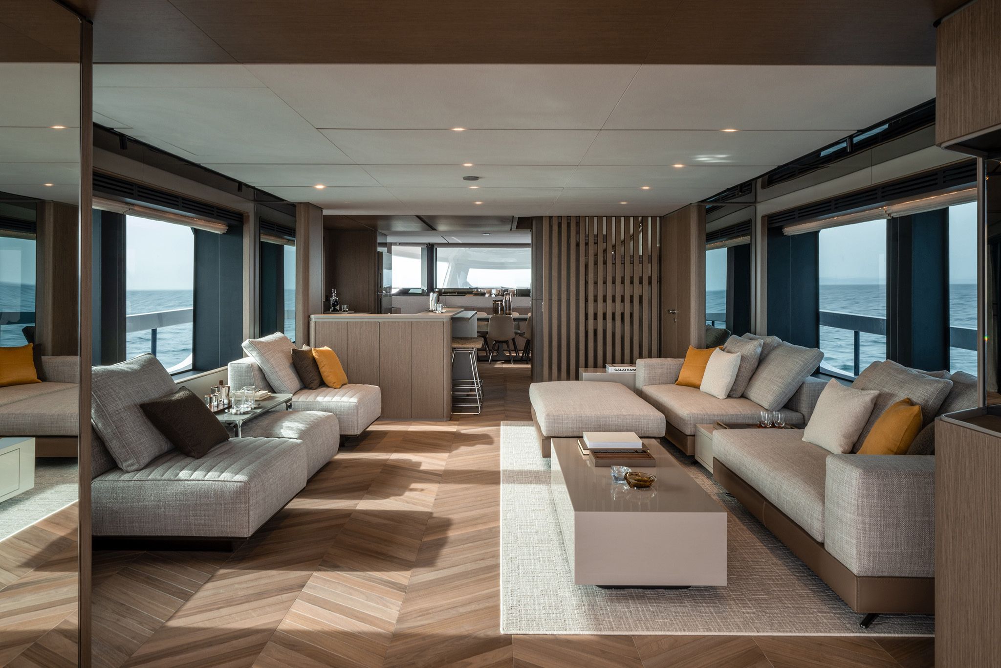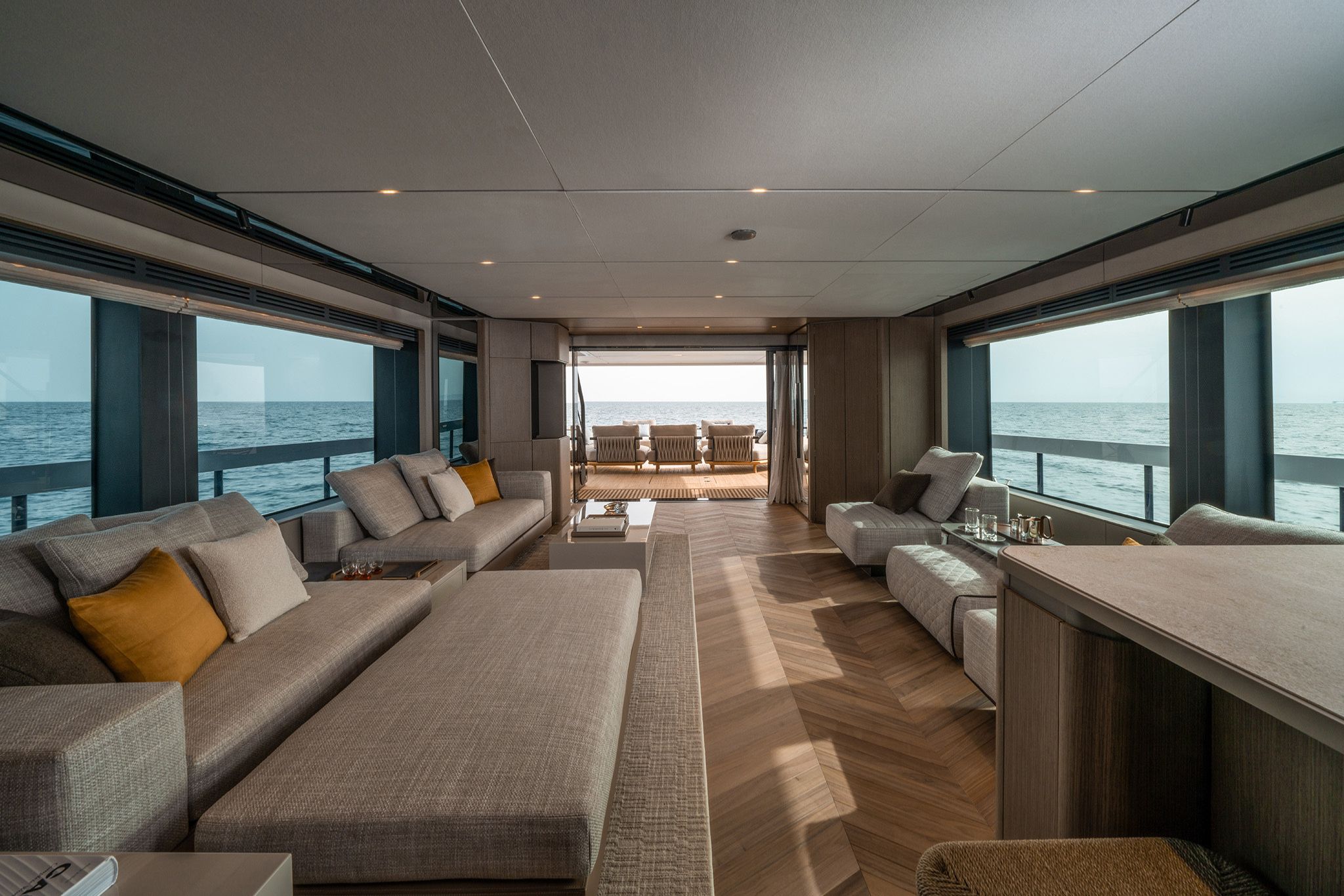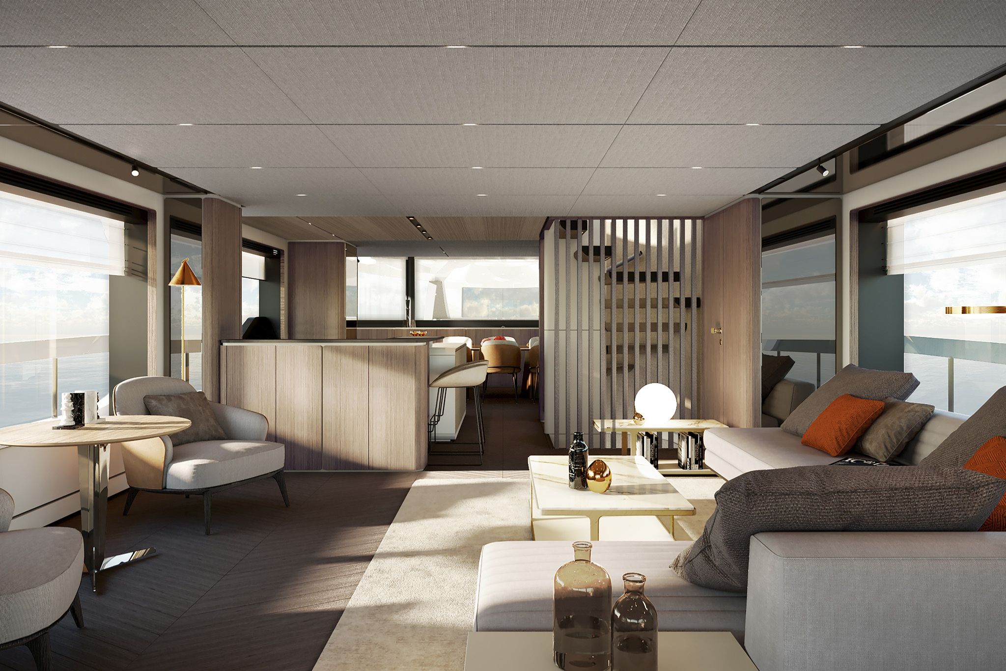 Indendørs skaber åbne planløsninger og store glaspartier en flydende overgang mellem inde og ude. For første gang i Ferrettis historie kan der tilføjes et træningsrum, og den overdækkede skylounge giver panoramaudsigt året rundt. Med bæredygtige materialer og solcelletag forener INFYNITO 90 luksus, innovation og miljøbevidsthed i én imponerende yacht.