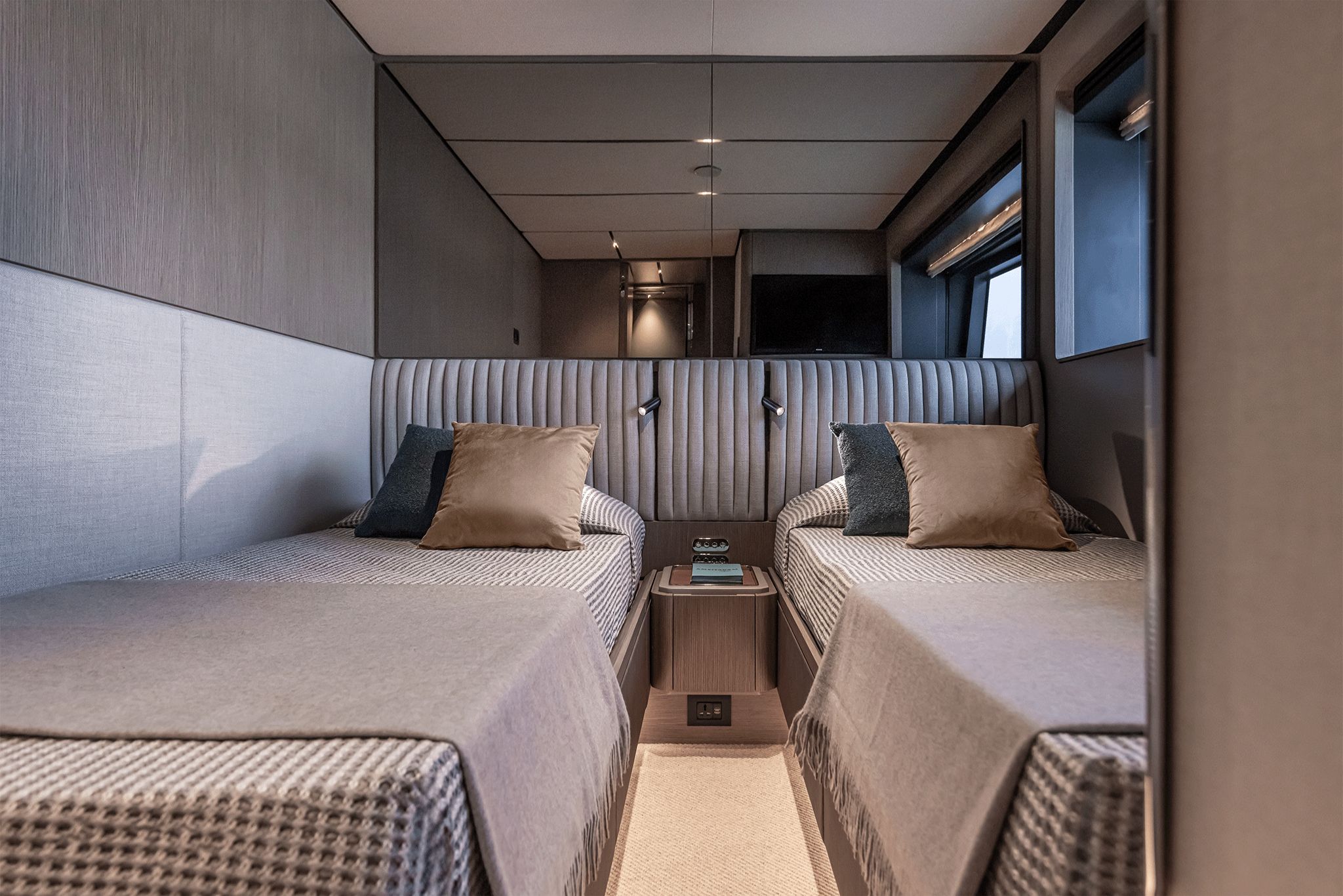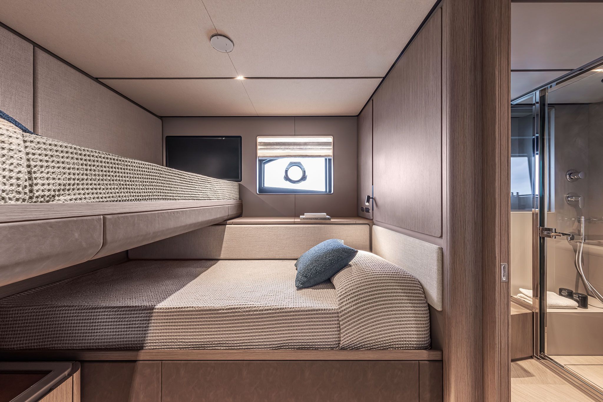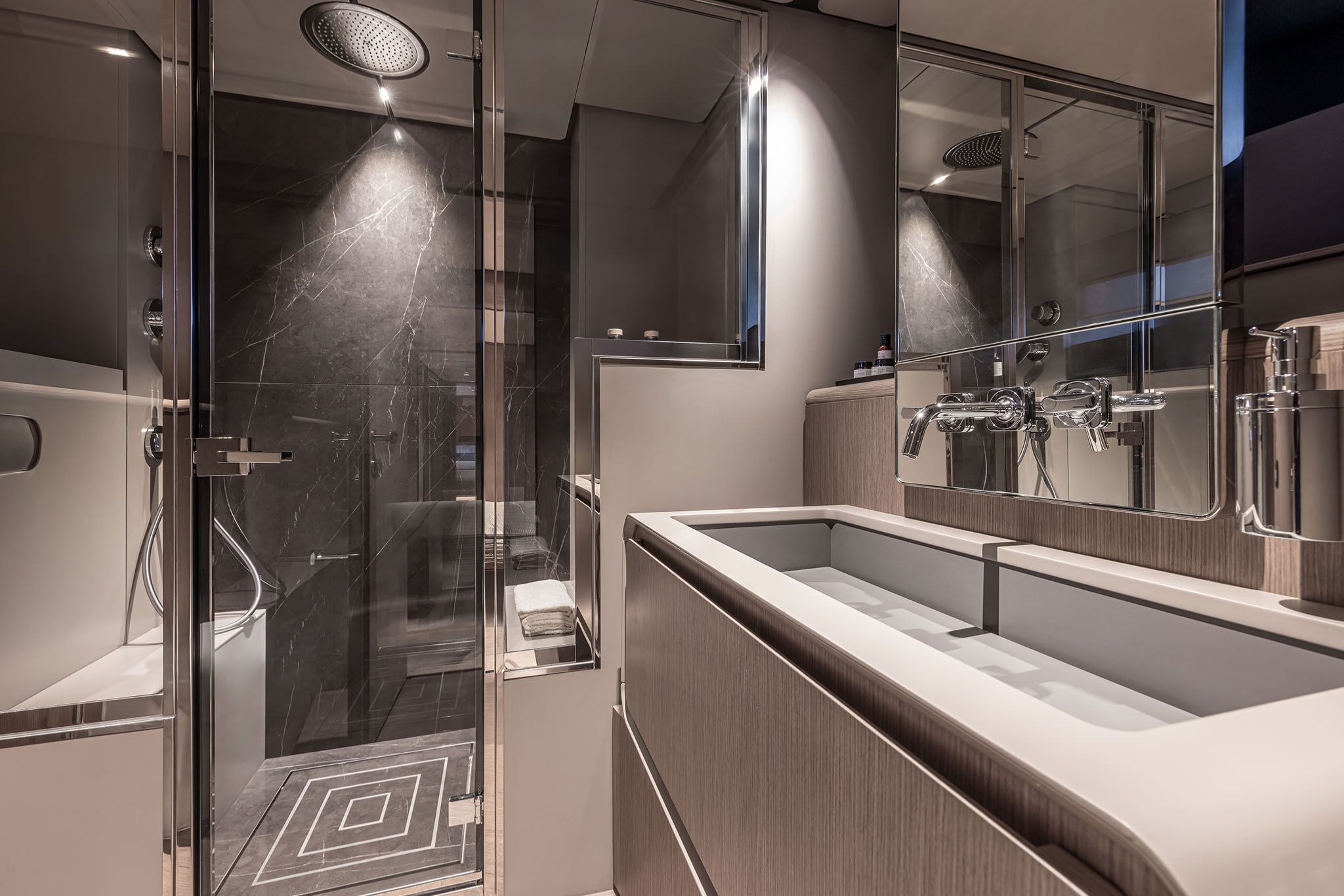 Indendørs skaber åbne planløsninger og store glaspartier en flydende overgang mellem inde og ude. For første gang i Ferrettis historie kan der tilføjes et træningsrum, og den overdækkede skylounge giver panoramaudsigt året rundt. Med bæredygtige materialer og solcelletag forener INFYNITO 90 luksus, innovation og miljøbevidsthed i én imponerende yacht.
