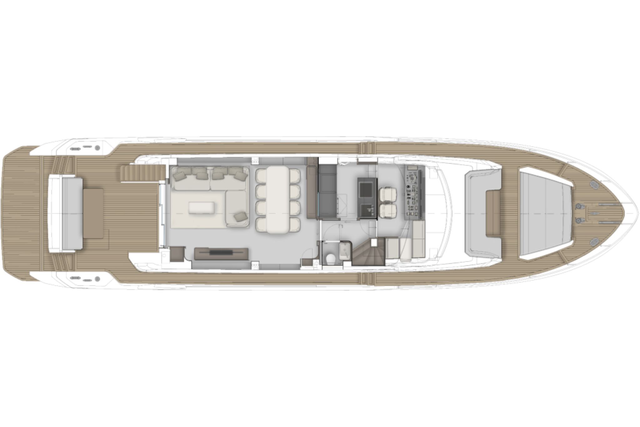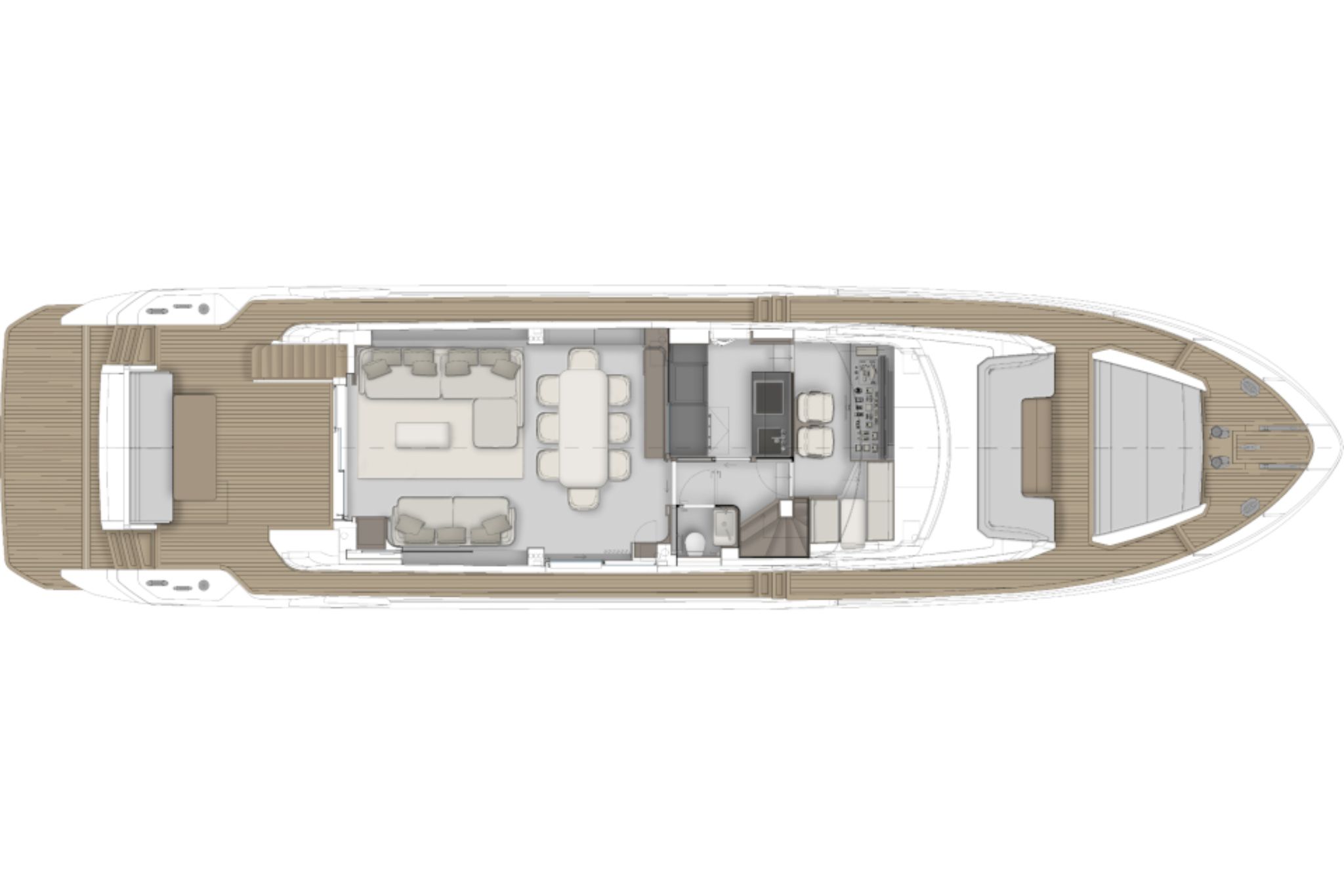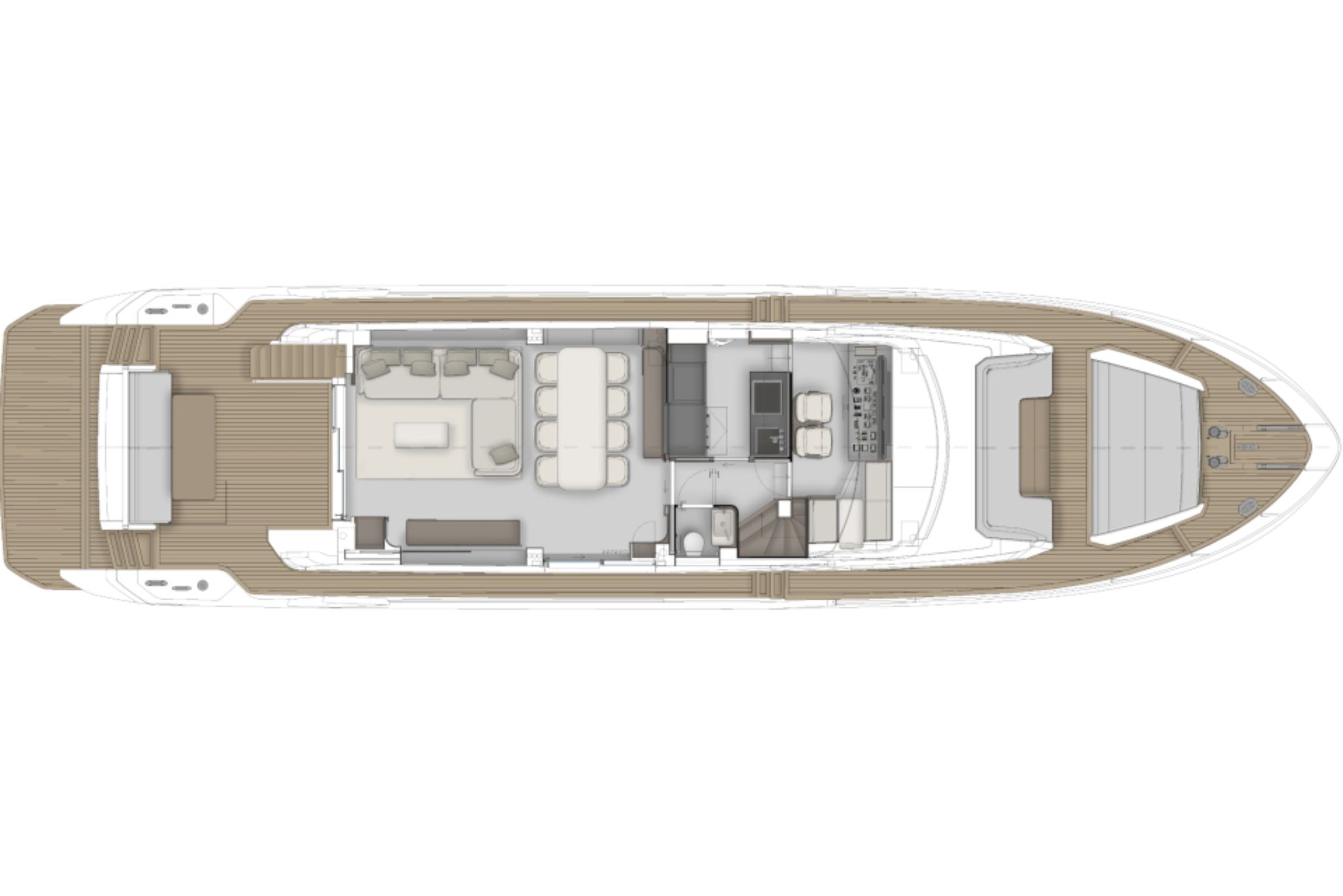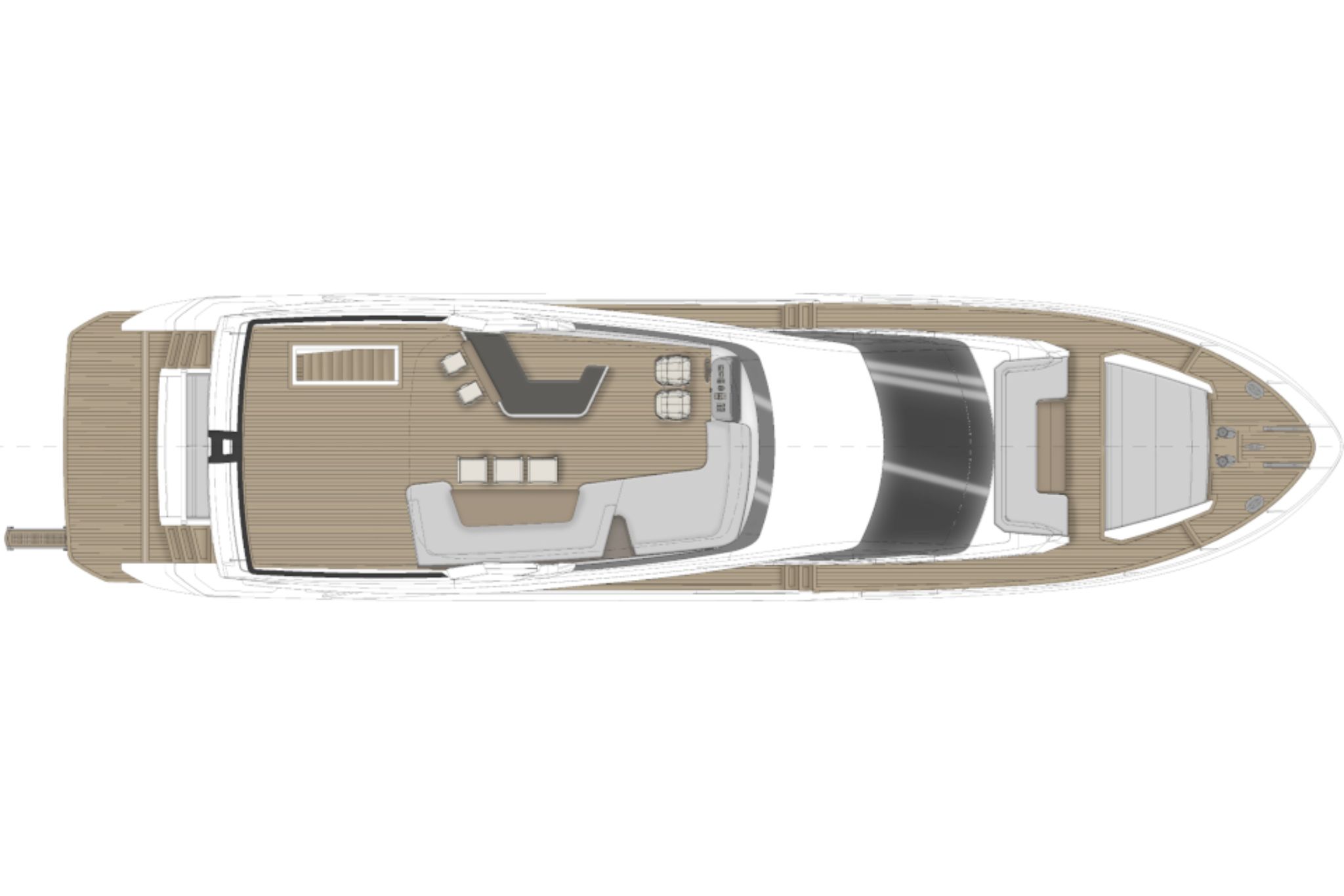 Her får du rummelige opholdsarealer med store panoramavinduer, der åbner udsigten mod havet og lader lyset strømme ind. Indretningen er præget af elegante materialer, moderne linjer og en æstetik, der skaber en eksklusiv atmosfære både inde og ude. På dækket er der generøse loungeområder til afslapning og socialt samvær, mens flybridgen giver mulighed for at nyde sejladsen under åben himmel. Med denne model kombineres præstation, stil og komfort på et niveau, der gør enhver tur til en unik oplevelse.