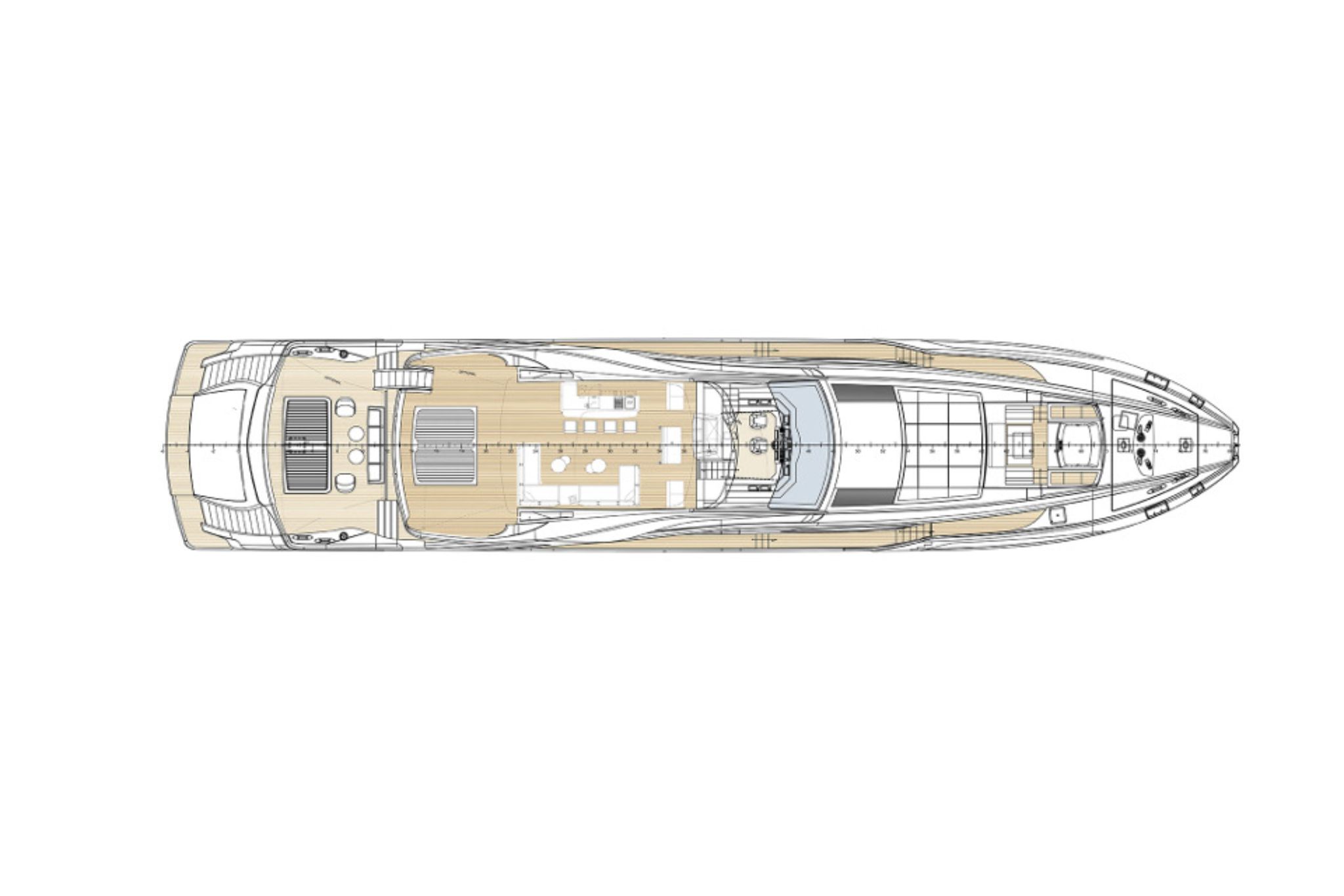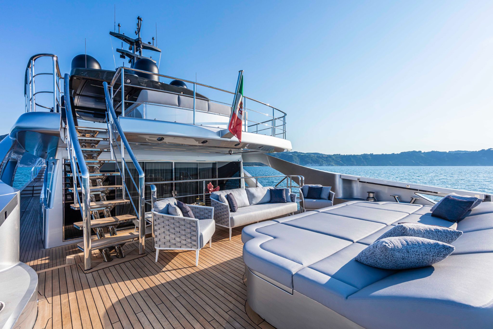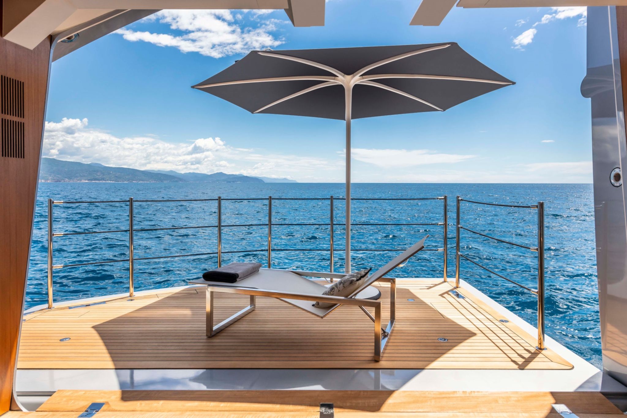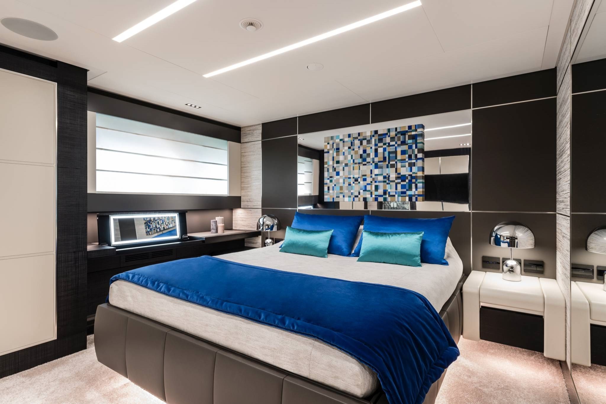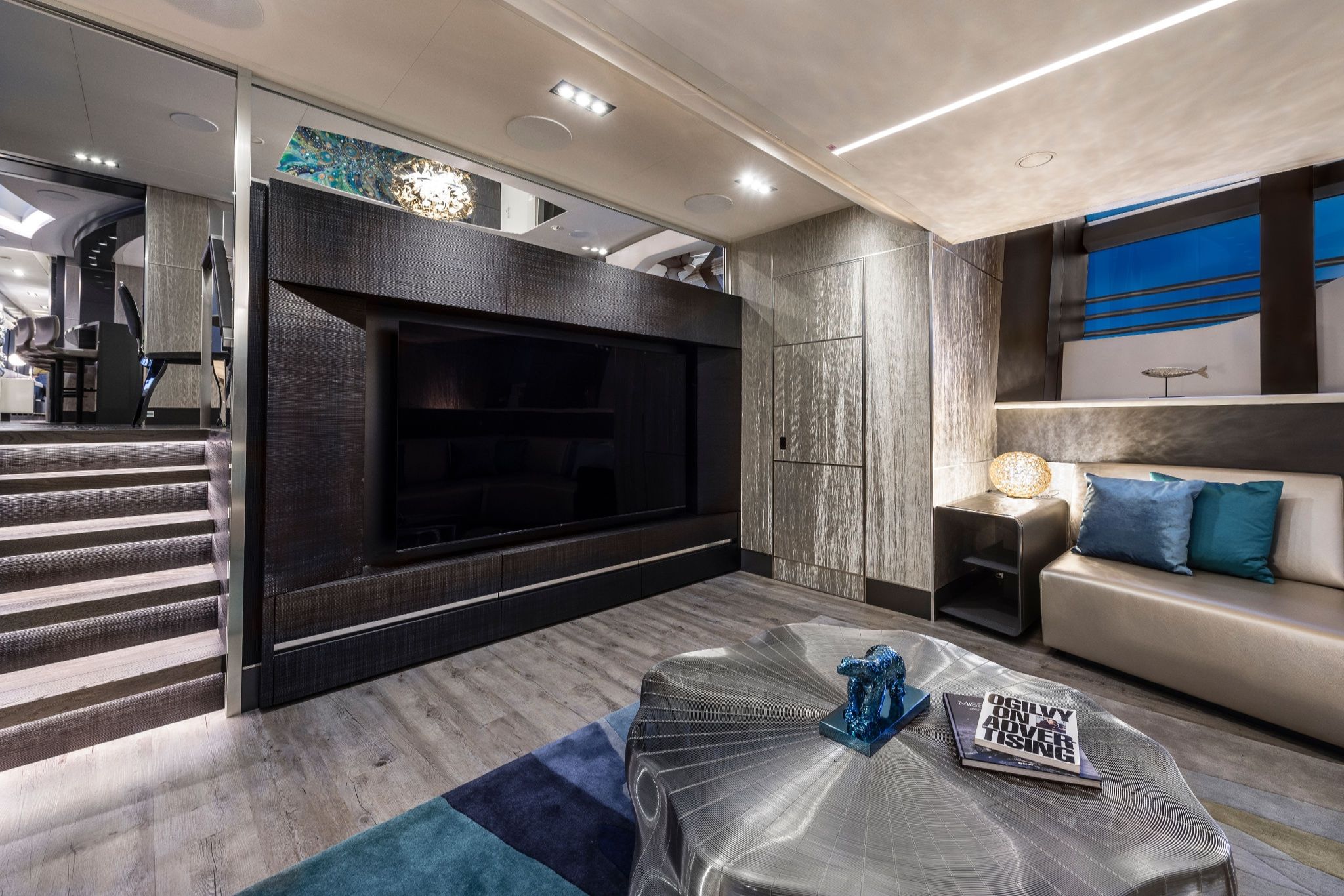 Ombord finder man tre store dæk, rummelige udendørsarealer og et revolutionerende agterparti, der inviterer til socialt samvær og vandsport. Interiøret skræddersys efter ejerens ønsker, mens avancerede domotics, Seakeeper-stabilisatorer og de nyeste elektroniske systemer sikrer komfort og velvære – selv for anker.