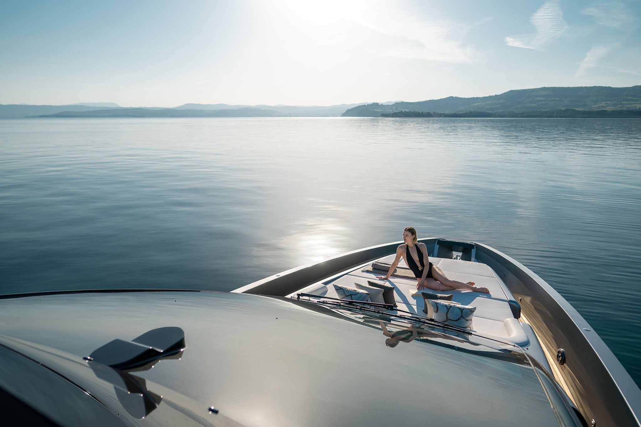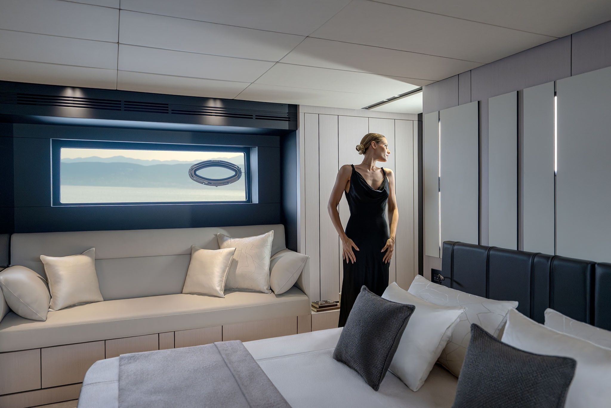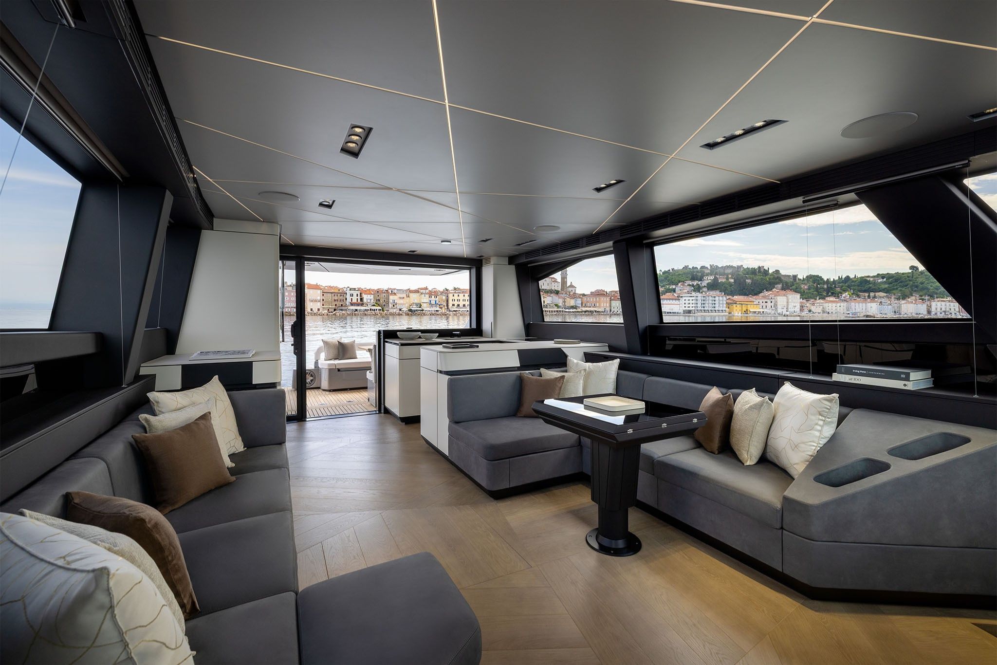 Indretningen er skabt til både socialt samvær og afslapning. I salonen skaber to parallelle sofaer et elegant loungeområde, og agterdækket byder på et indbygget sofaarrangement, der efter ønske kan erstattes af en rummelig solseng.