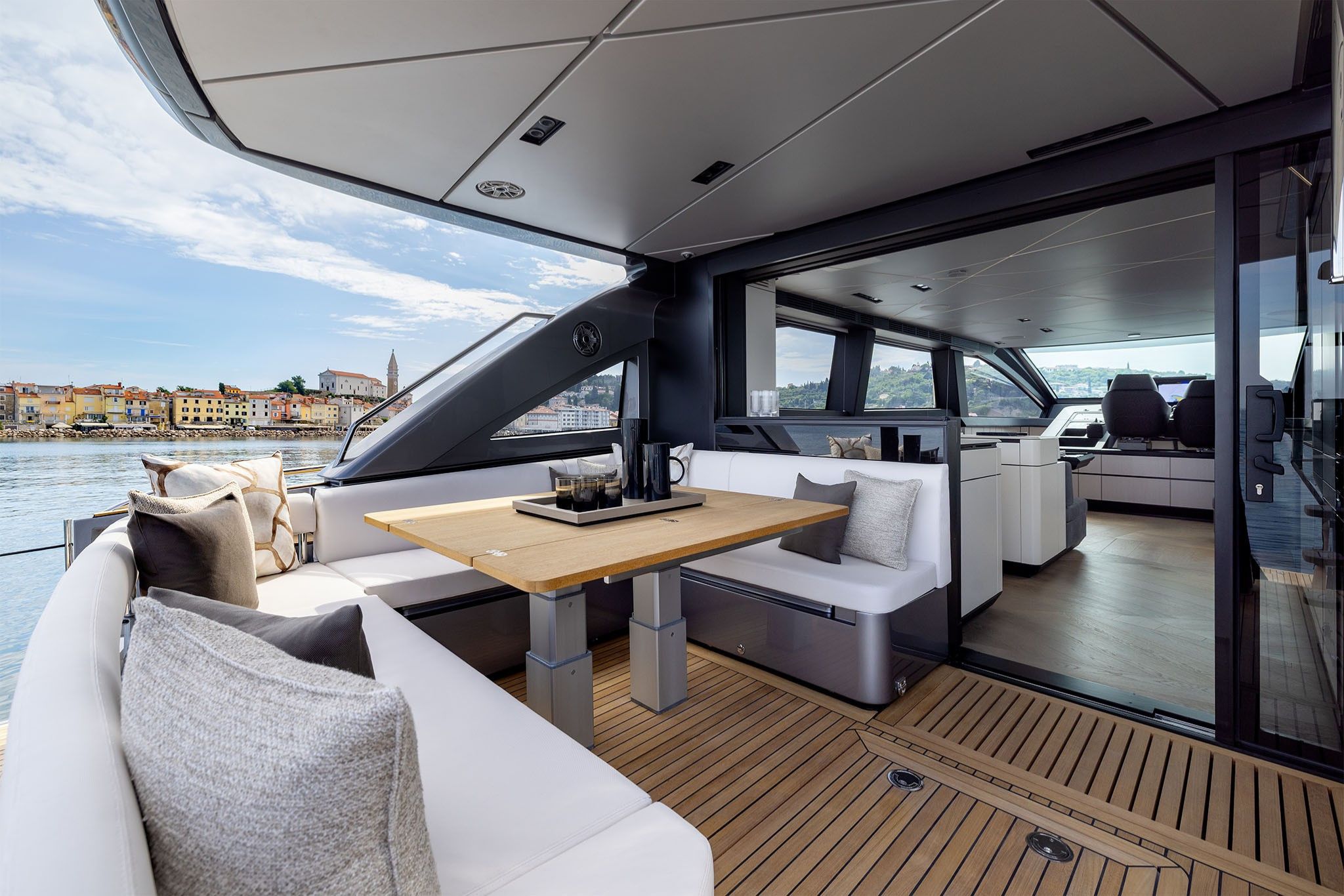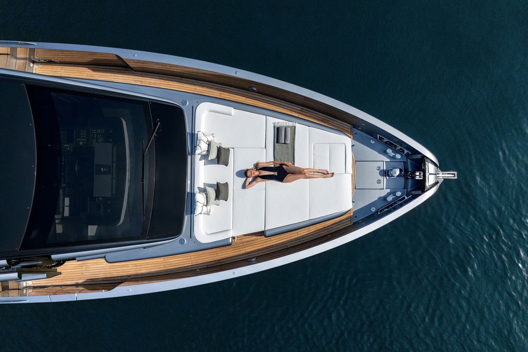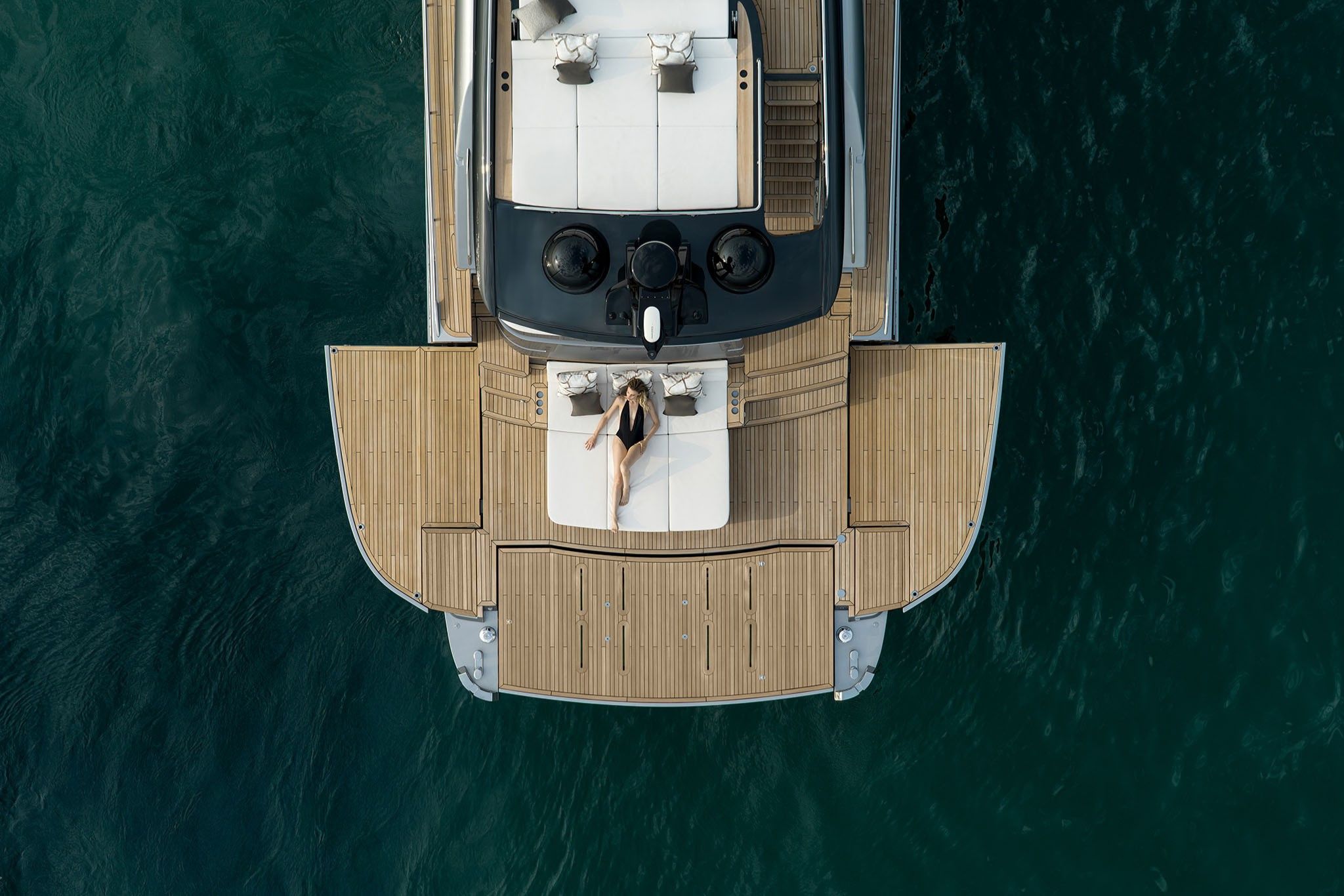På dækket åbner yachtens smarte designløsninger op for en flydende forbindelse mellem ude og inde. Kombinationen af dør og indfældet vindue forbinder cockpittet med salonen, mens de foldbare “wings” forvandler agterdækket til det største beach area i segmentet.