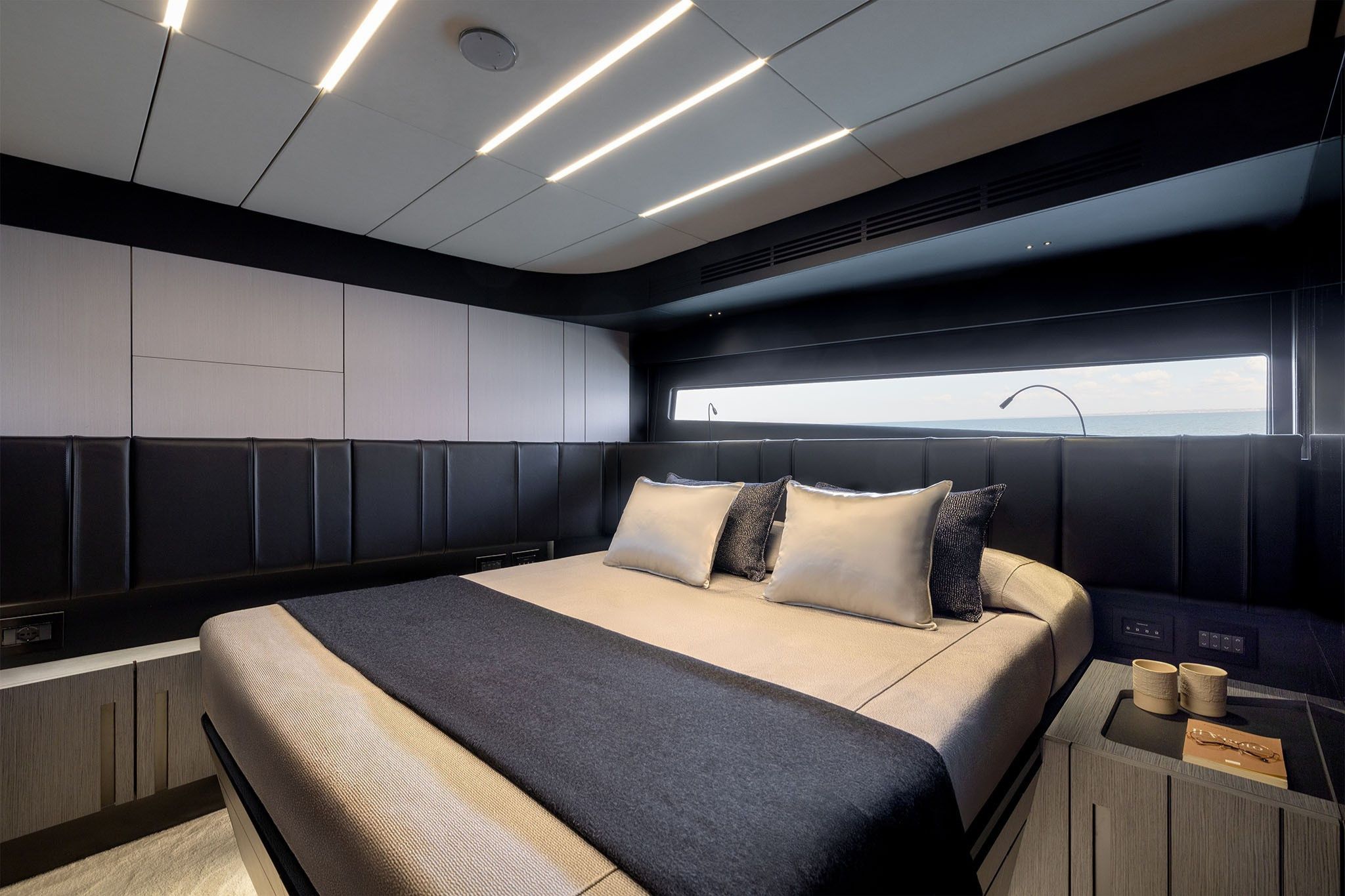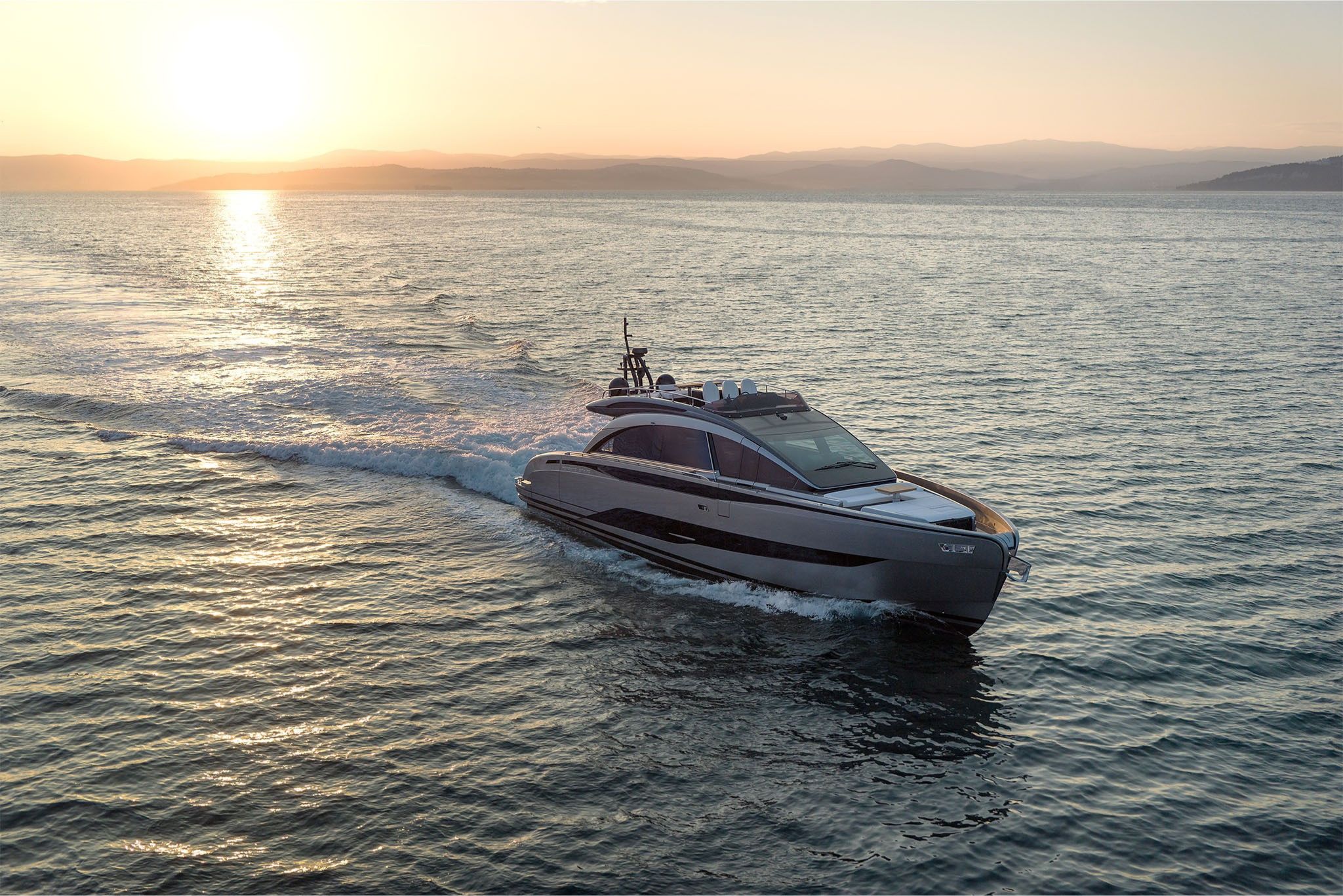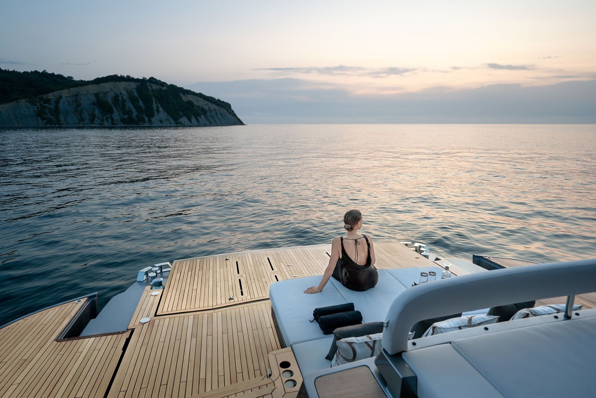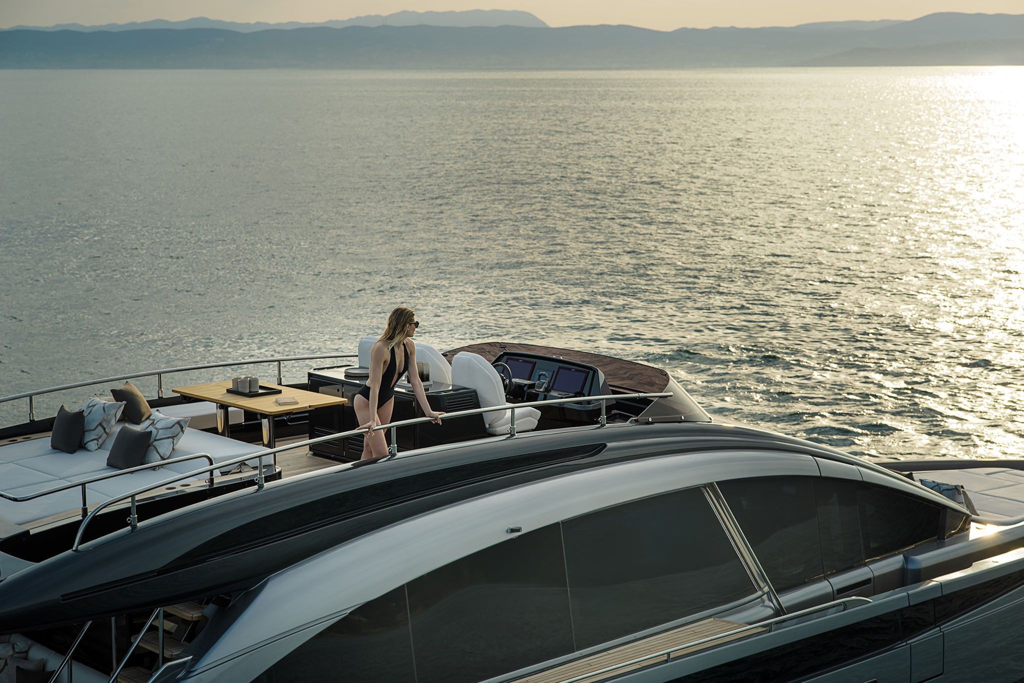 På dækket åbner yachtens smarte designløsninger op for en flydende forbindelse mellem ude og inde. Kombinationen af dør og indfældet vindue forbinder cockpittet med salonen, mens de foldbare “wings” forvandler agterdækket til det største beach area i segmentet.