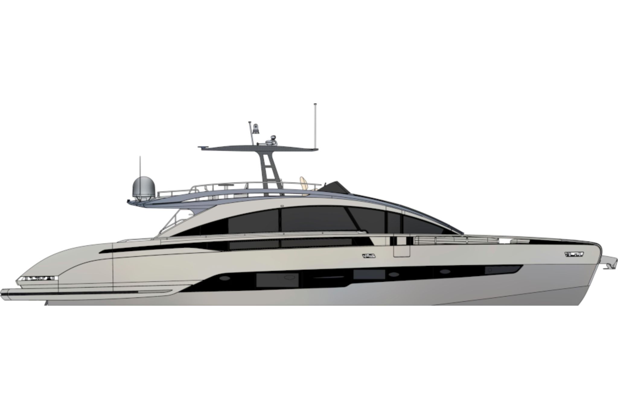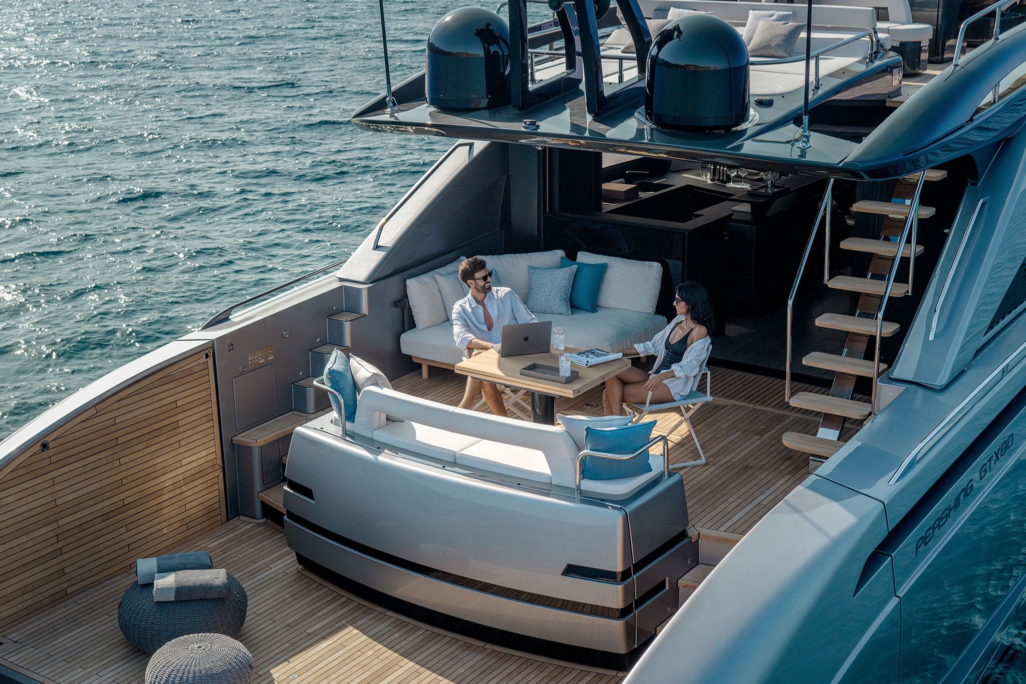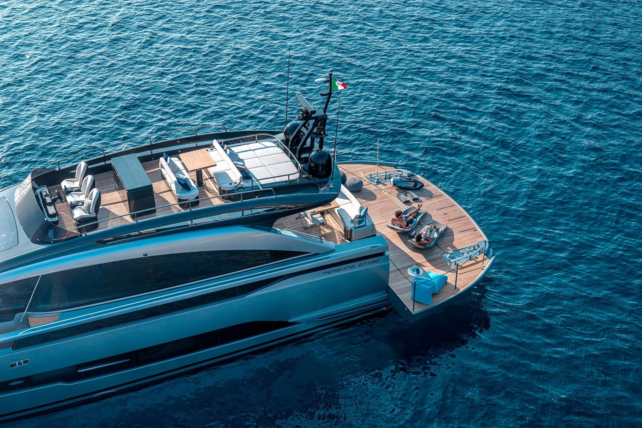 Pershing GTX80 er klædt i den klassiske Pershing-grå farve. Den har et strømlinet og sporty design med store glasfacader, som bader interiøret i masser af naturligt lys og giver et fantastisk udsyn. Karakteristisk for GTX-serien er de store åbne udendørsarealer, som byder på ren luksus, fornøjelse og innovative løsninger.