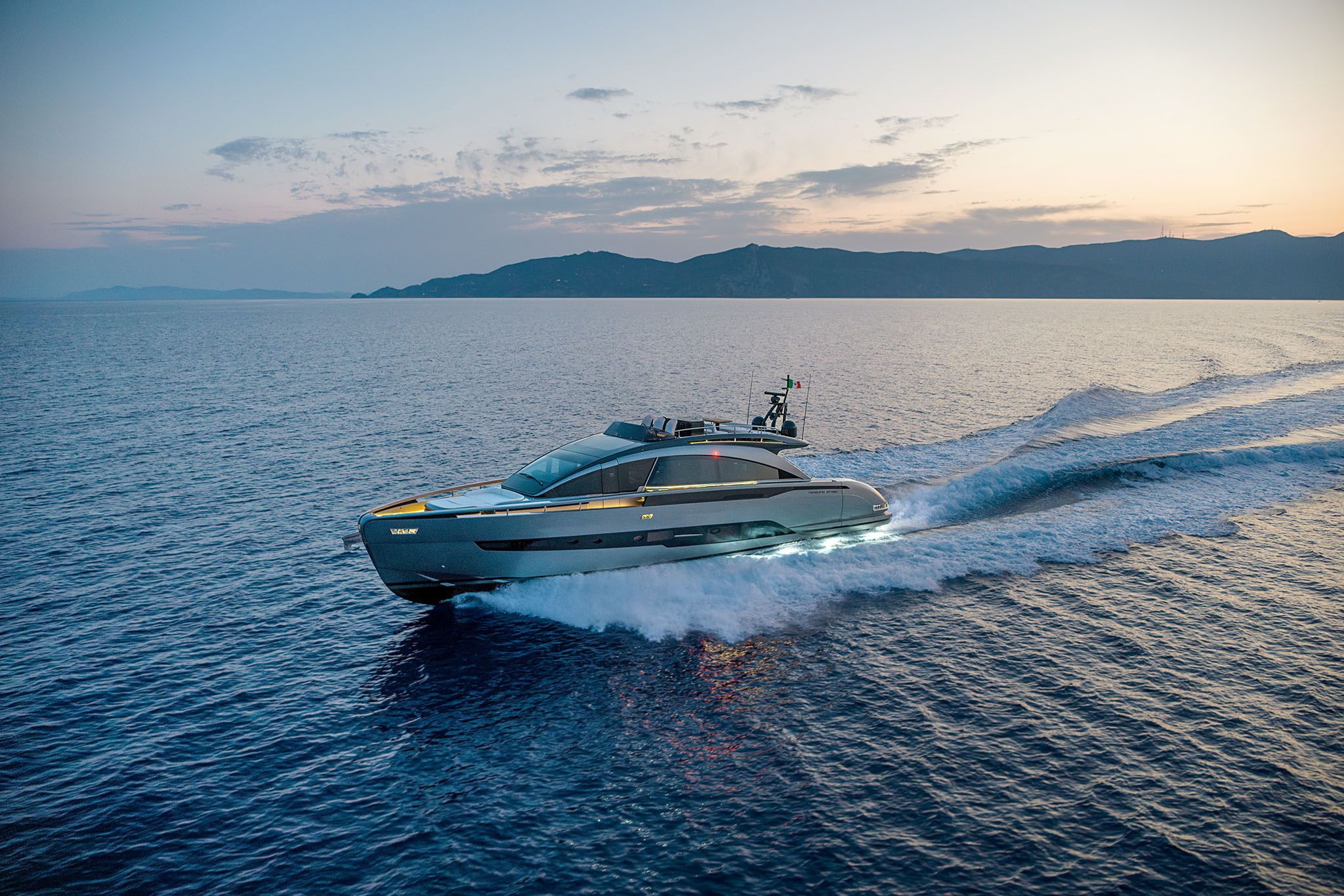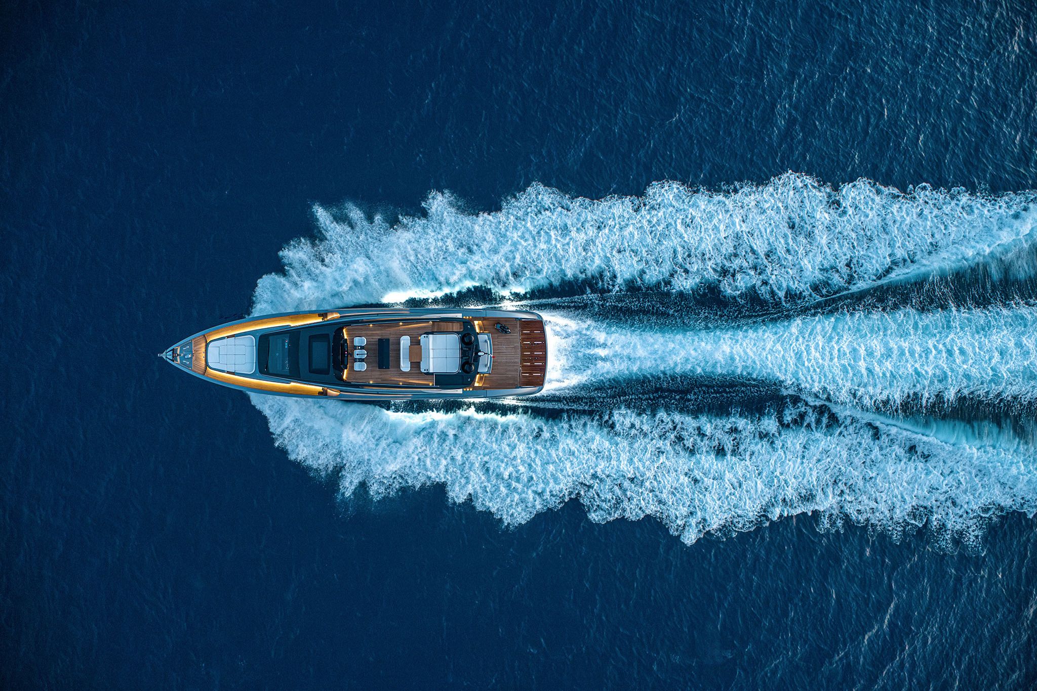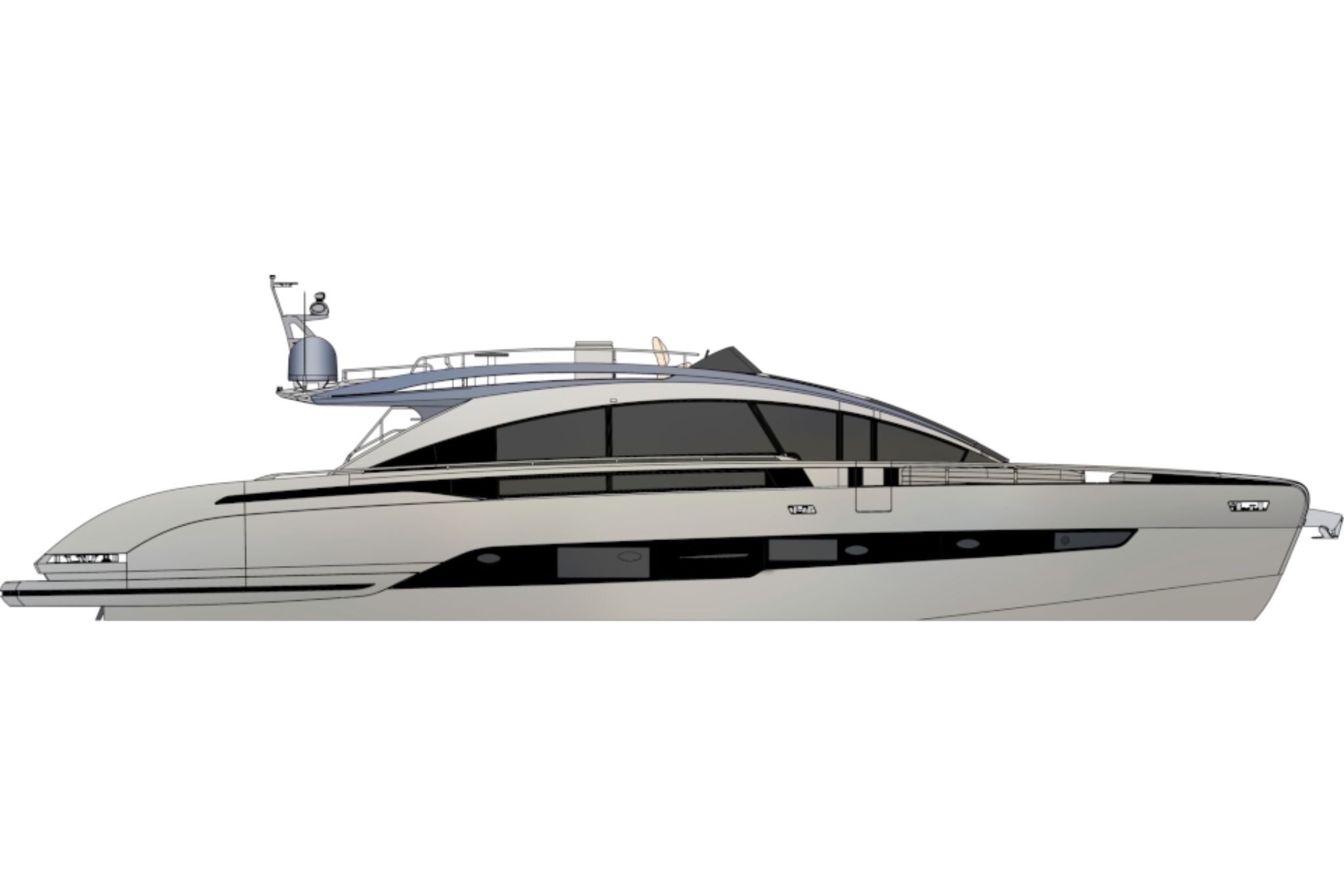 Pershing GTX80 er klædt i den klassiske Pershing-grå farve. Den har et strømlinet og sporty design med store glasfacader, som bader interiøret i masser af naturligt lys og giver et fantastisk udsyn. Karakteristisk for GTX-serien er de store åbne udendørsarealer, som byder på ren luksus, fornøjelse og innovative løsninger.