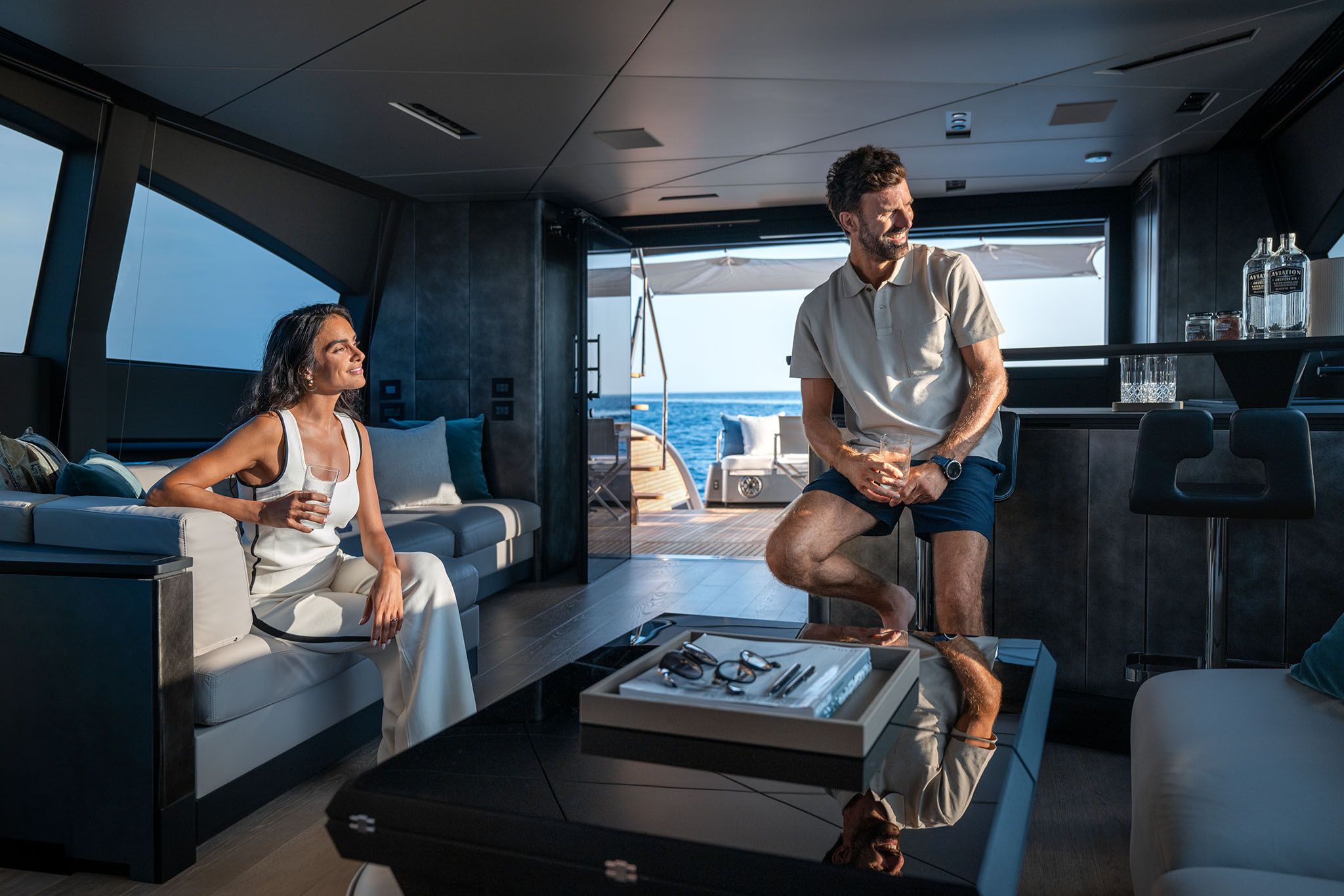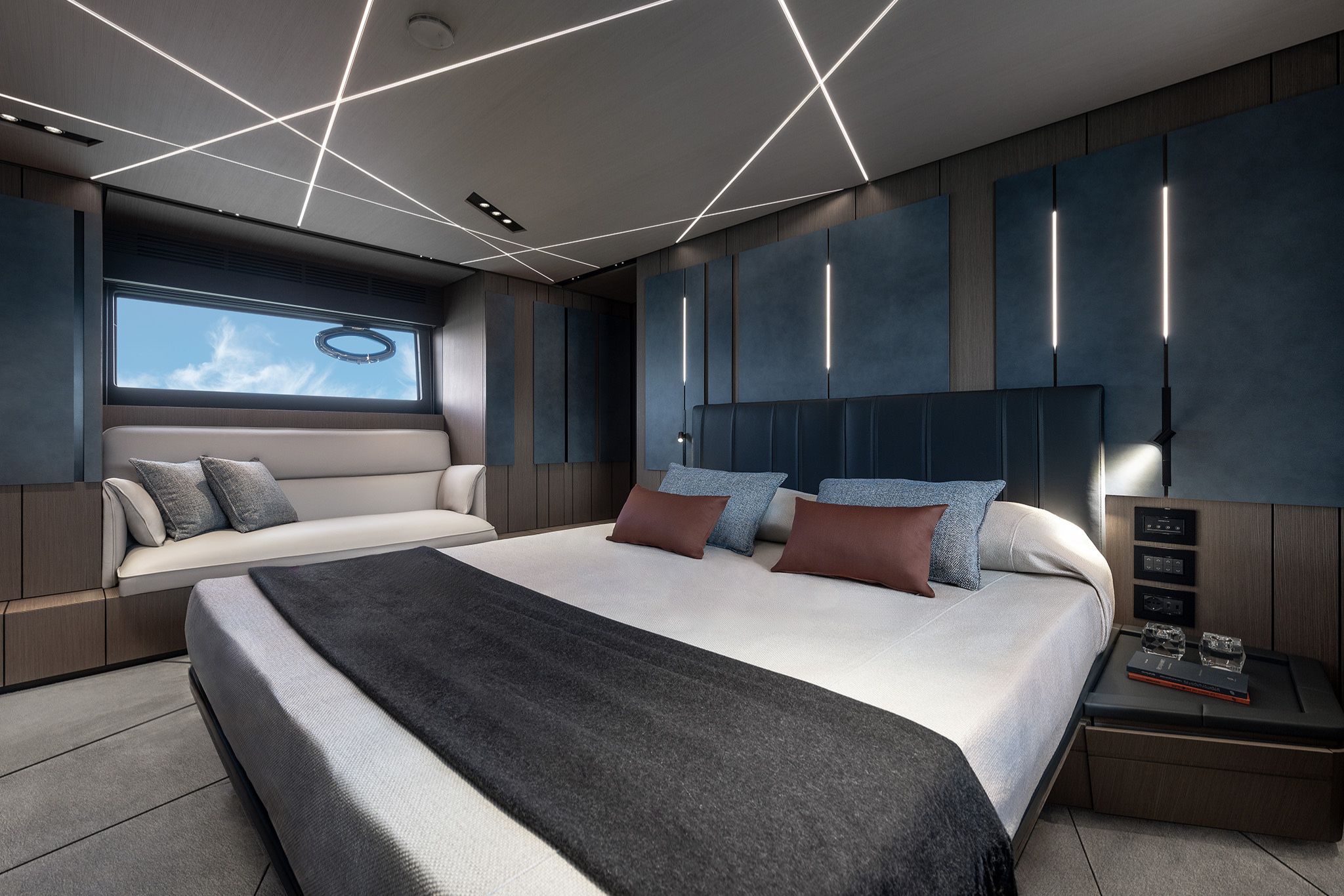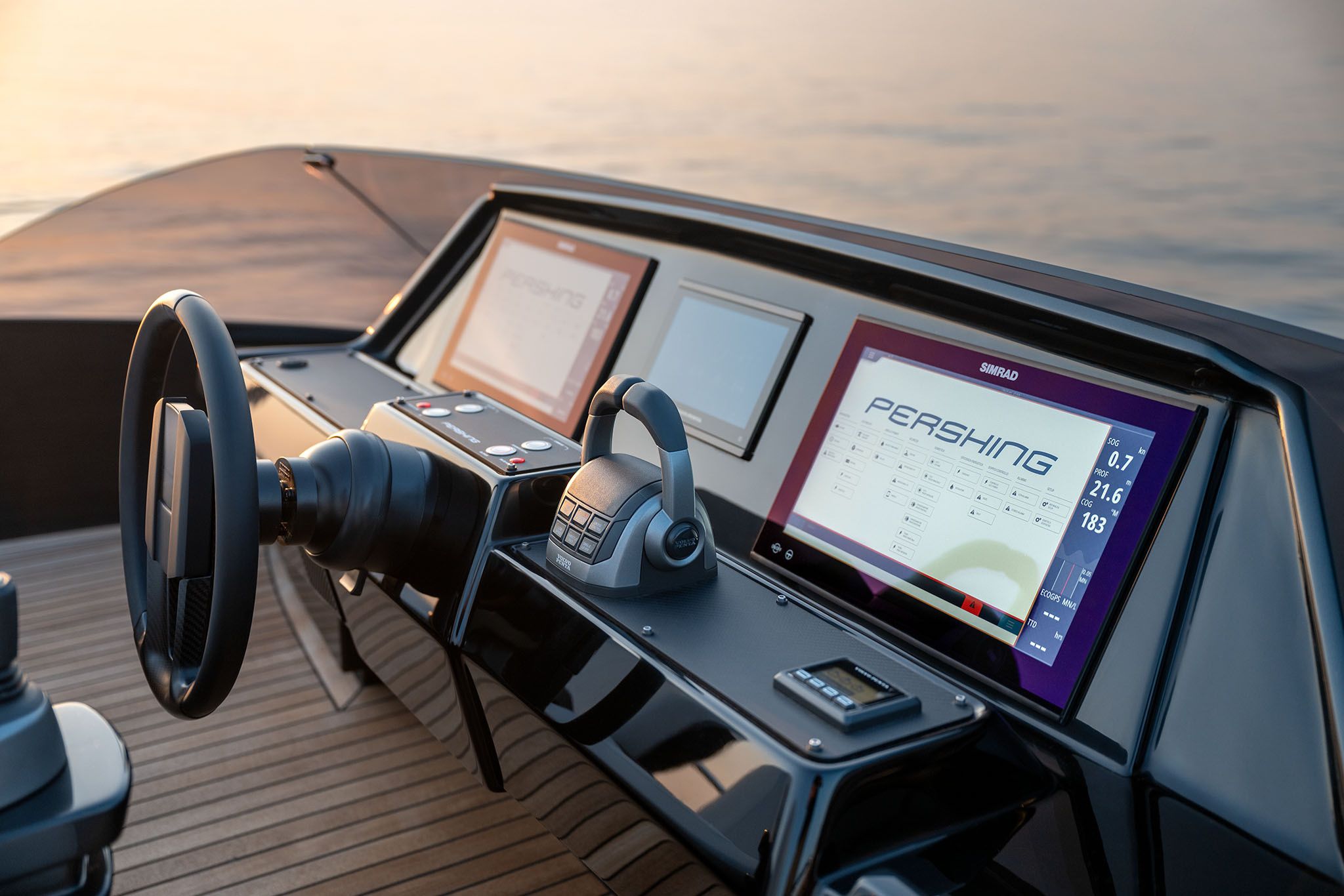 Pershing GTX80 er indrettet med fokus på ren nydelse, stil og personlighed. De store glasfacader bader interiøret i masser af naturligt lys. Den eksklusive italienske indretning gør opholdet til en sand æstetisk fornøjelse.