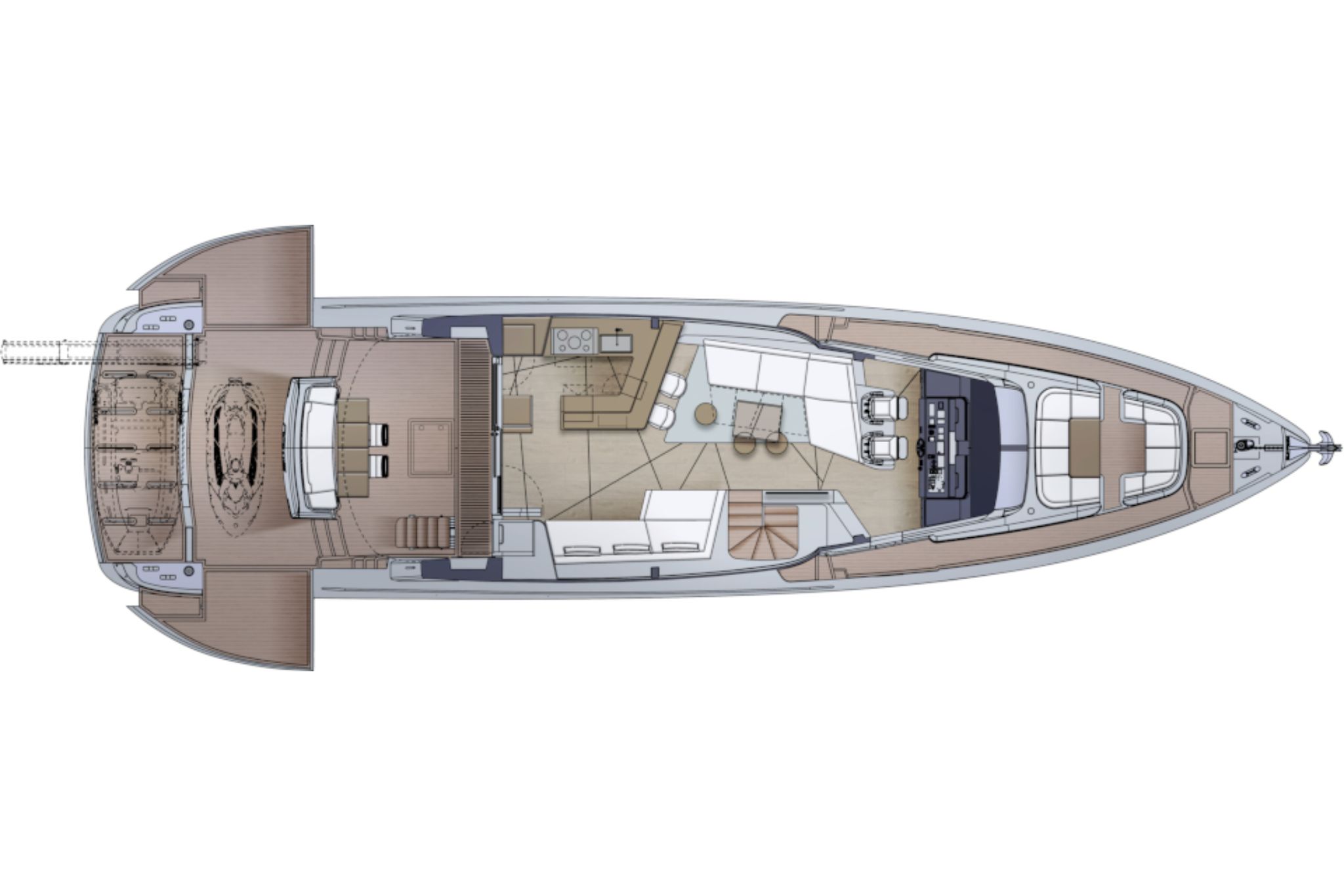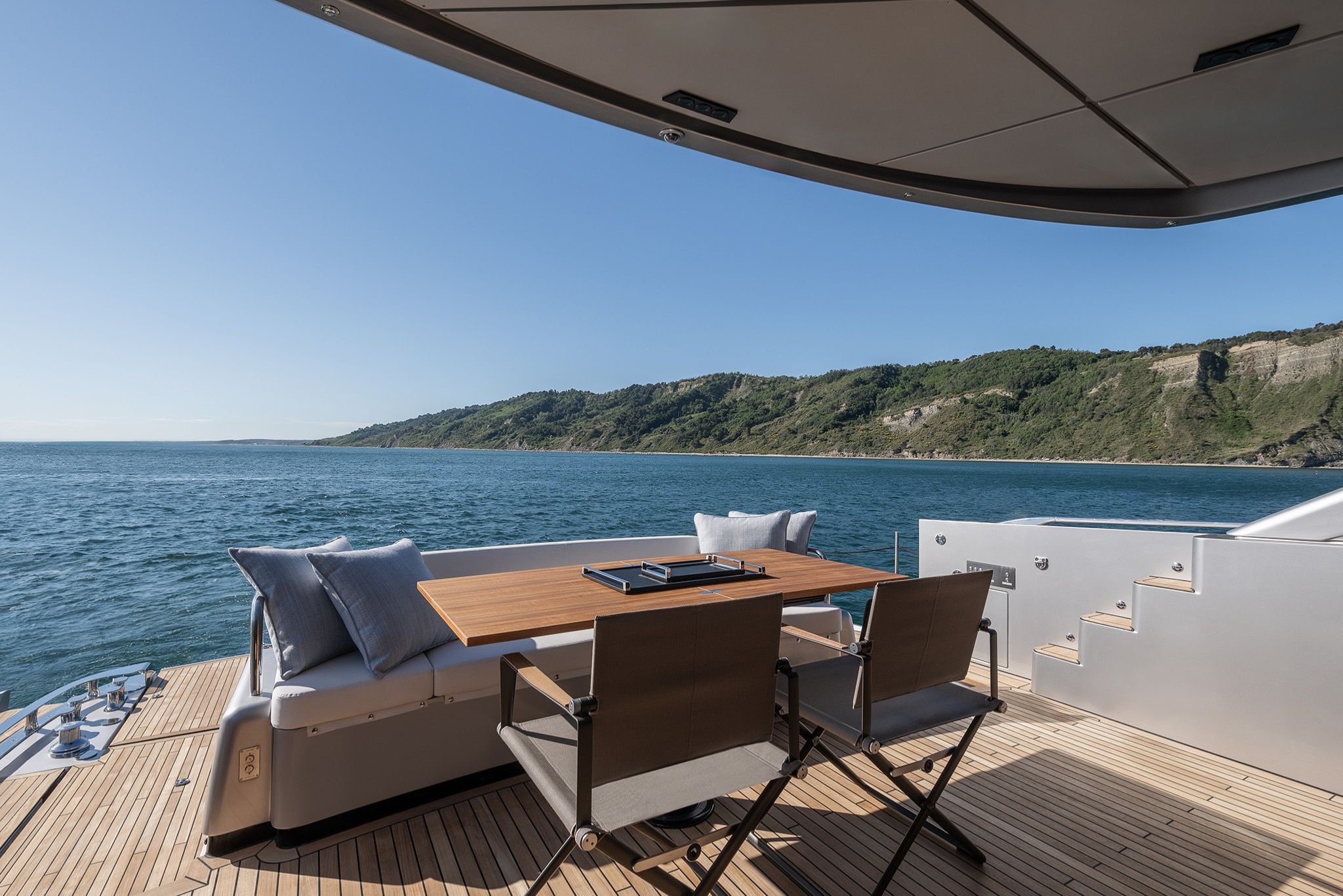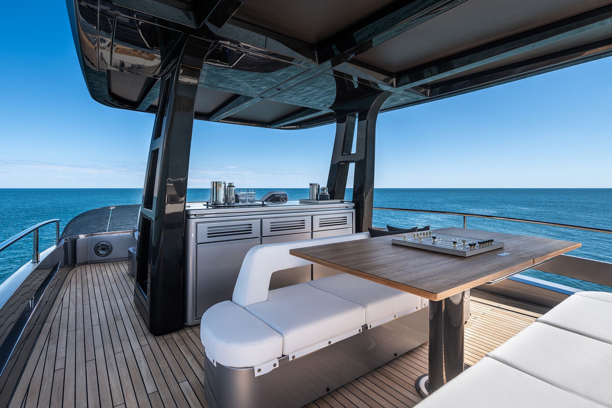 Yachten har flere innovative udearealer bl.a. en stor solterrasse, hvor du kan slappe af og nyde den fantastiske udsigt ud over vandet. Vha. hydraulik kan yachtens sider åbnes, hvor du kan nyde en flot udsigt, imens du flyver hen over vandet. GTX80 rummer desuden en indbygget hangar med plads til en tenderbåd og jetski.