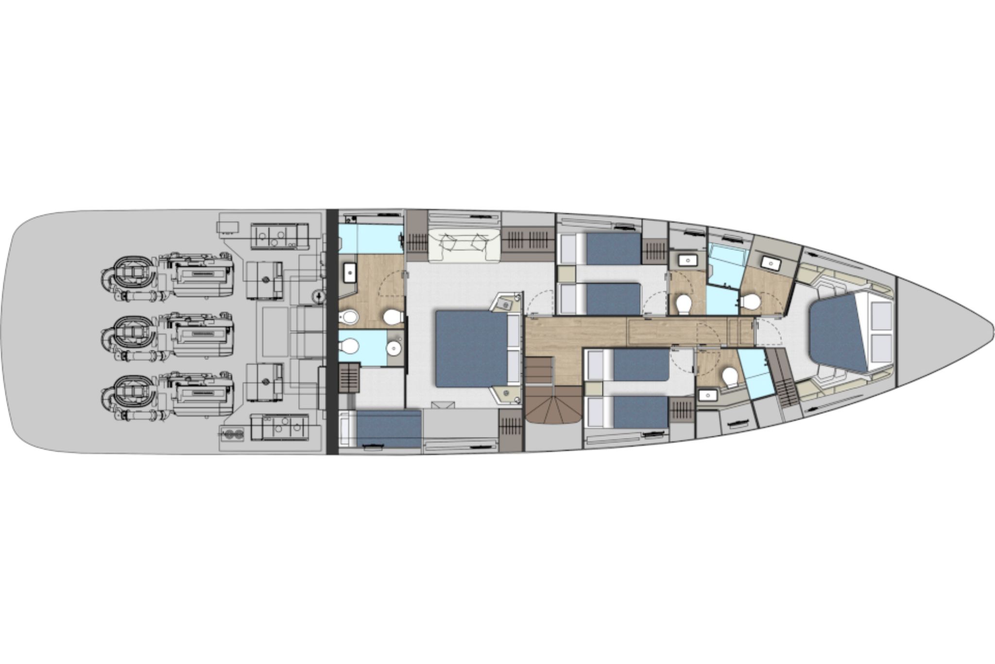 Yachtens nederste dæk er indrettet med fire kahytter med en-suite badeværelser. Ejerkahytten er placeret agter og er i fuld bredde. Det er et skønt opholdsrum, som er indrettet med en dobbeltseng, sofa og opbevaringsplads. VIP-kahytten er placeret i stævnen og er udstyret med en dobbeltseng. Der er desuden to gæstekahytter med to enkeltsenge.
